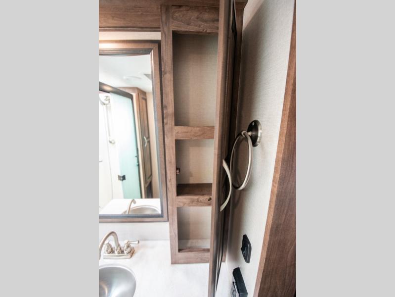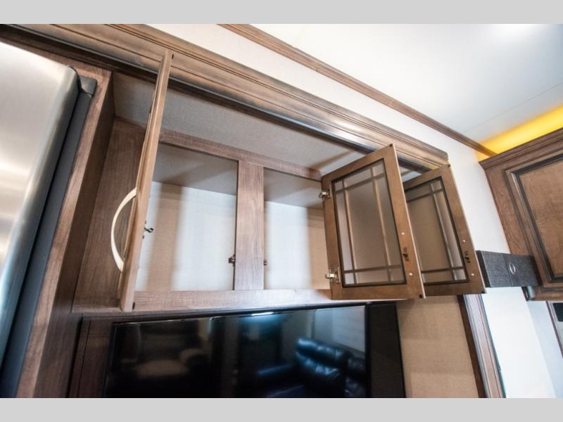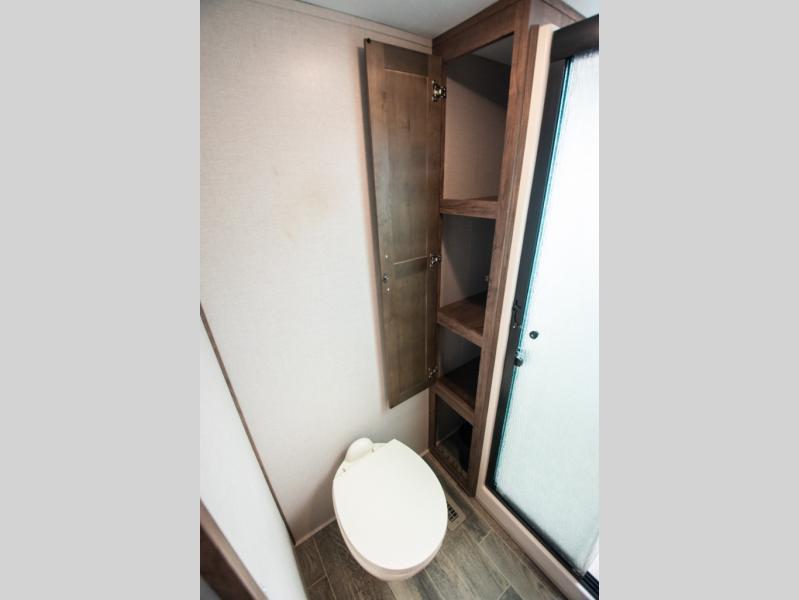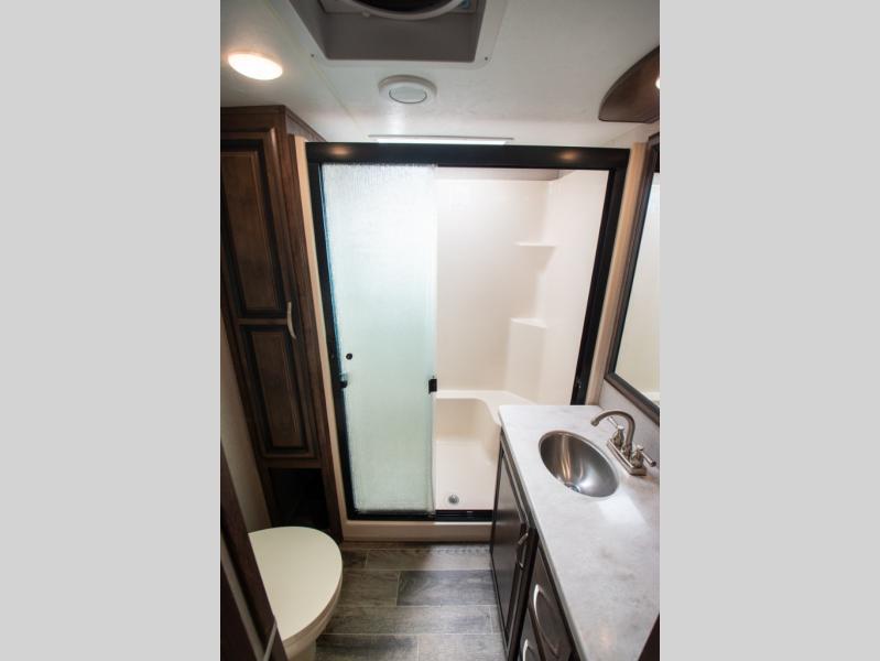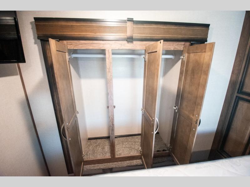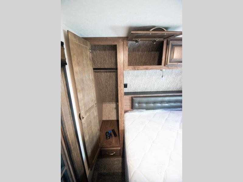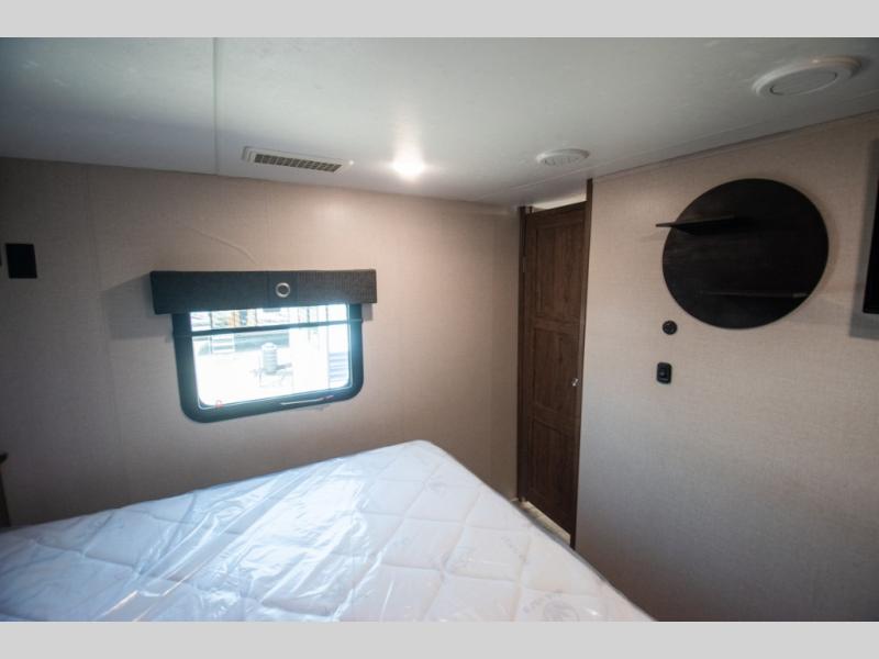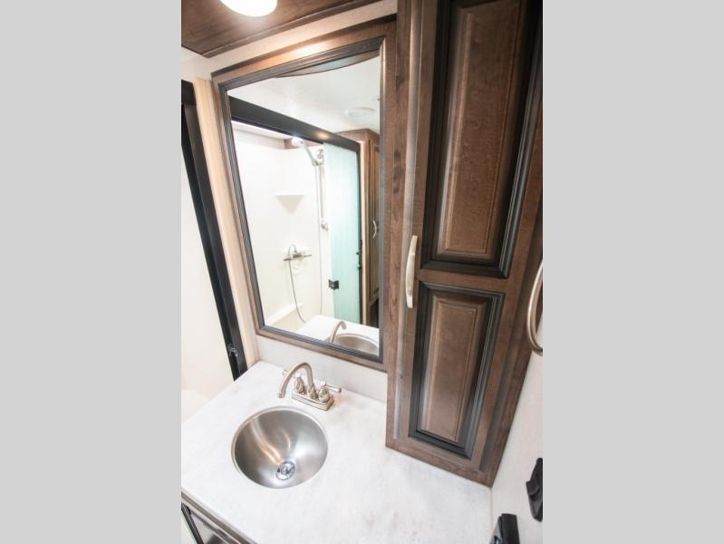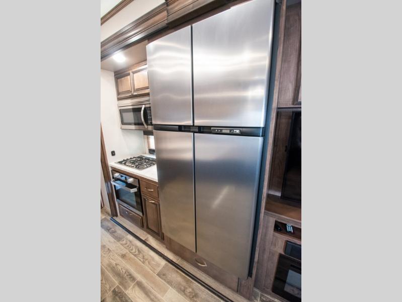 When you choose to camp with a KZ Venom toy hauler fifth wheel you are choosing upscale features and luxury throughout. You will find a 7" monitor MyRV OneTouch control panel with downloadable app which monitors tank and battery levels, controls slide rooms, leveling system, awnings, plus inside and outside lighting. In the garage there is a roll-down screen wall allowing the fresh air to flow in and out, a Zero Gravity ramp door with easy lift assist, plus an E-Track tie-down system allowing you to secure your load quickly. And the interior offers a chef's appliance package, and comfortable bedroom accommodations, plus more! Come select your Venom luxury toy hauler fifth wheel today!