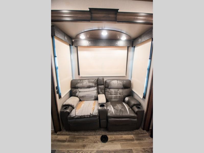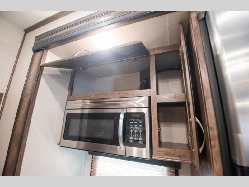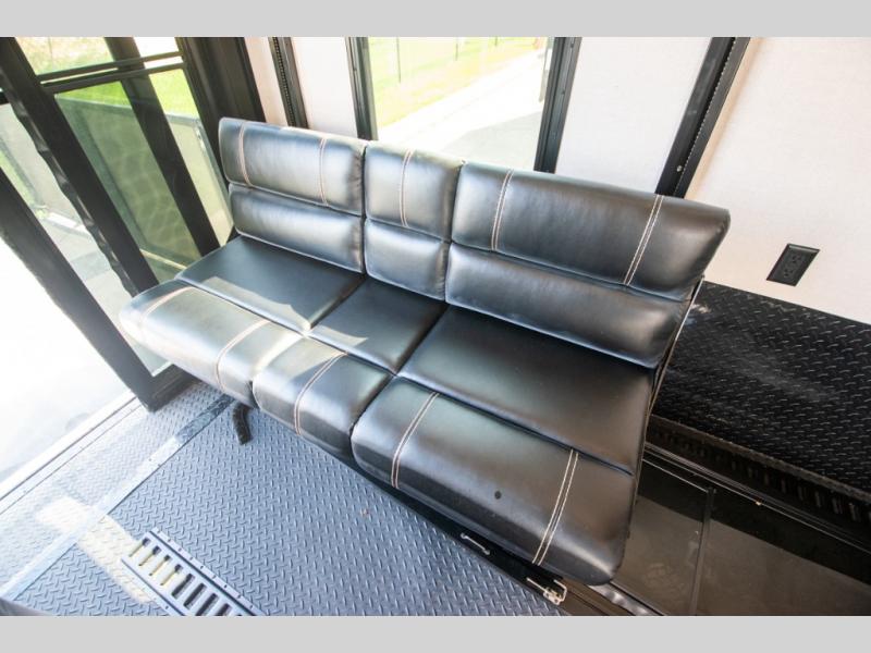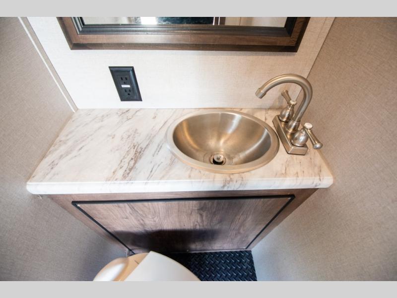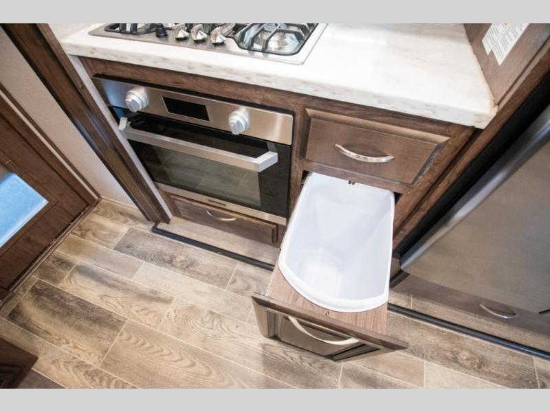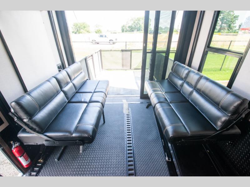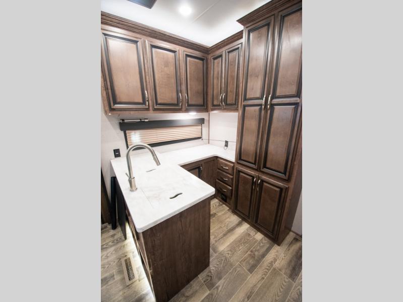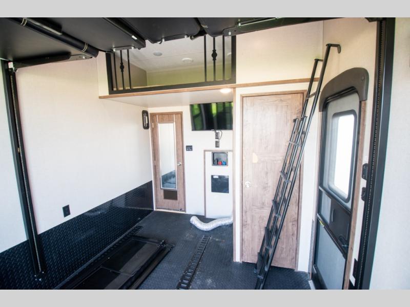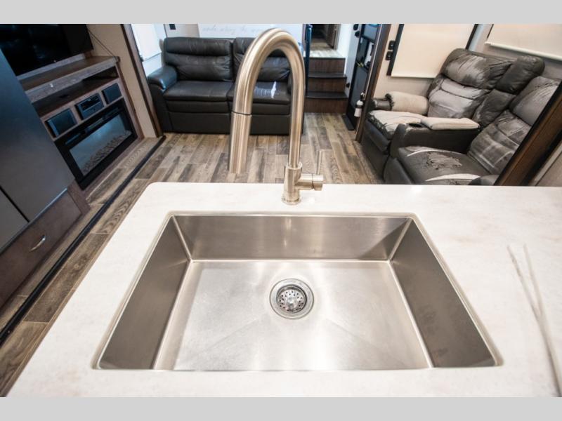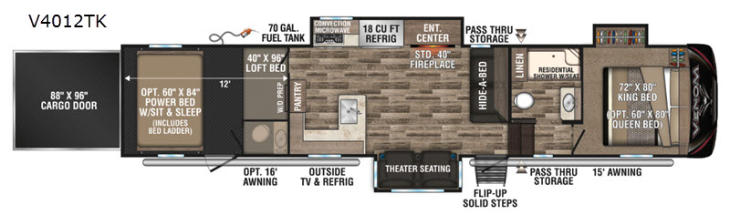 You can park and secure your toys in a 12' cargo area to travel to your favorite off-road park when you have this fifth wheel in tow. The separate garage also includes a convenience half bath, a side man door, and an optional power bed with dual sofas if you would like this area to double as extra living and sleeping space. You can even add a washer and dryer option if you like. You may decide to invite the whole gang since the main living and kitchen area also has a 40" x 96" loft bed, a sofa, and theater seats that someone may even fall asleep on. And the kitchen U-shaped counter allows you to keep everyone fueled just like the 70 gallon fuel tank will keep the toys ready to ride the whole time!
