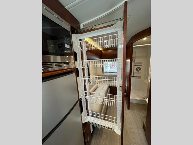 Freedom awaits you with the Serenity Class B+ diesel motorhome by Leisure Travel Vans. The aerodynamic exterior boosts fuel economy and lessens wind noise for a comfortable ride anywhere you want to go. Enjoy the strength and durability the Mercedes-Benz Sprinter chassis gives you to make those little spur of the moment travel decisions when you are out and about. With the Serenity there is no need to worry about reservations or local restaurants because you will always have a place to eat and sleep anywhere you go, and you'll find plenty of room to keep travel necessities tucked away for those unexpected journeys with the exterior storage compartment and the large pull-out pantry in the kitchen.