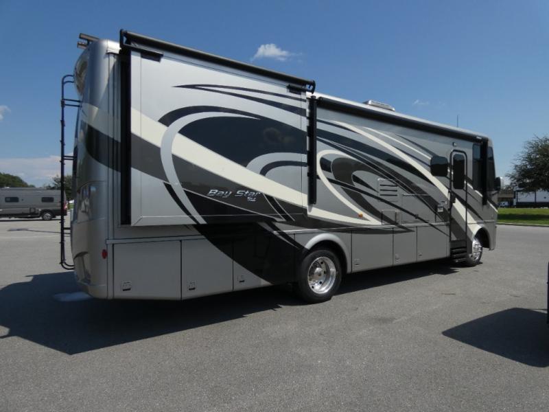Get ready for any road trip with a Newmar Bay Star class A motor home! Along the exterior there is a Masterpiece full painted graphics with clearcoat finish plus a DuraShield protection on the front cap which is sure to turn heads as soon as you enter the campground! Inside each model you will find Calypso Glazed Maple cabinet doors, solid surface counter tops in the bathroom and bedroom, plus Flexsteel deluxe leather sofa and front seats. Your trips are made easier with the 10 cu. ft. Norcold refrigerator and the 30" over-the-range microwave. You won't be lacking for entertainment with the Vizio LED TV and DVD player in the living and bedroom area plus there is a dash radio/CD player. For luxury and convenience you will want a Bay Star class A motor home by Newmar! Come select your model today!
