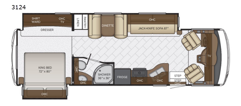 This Bay Star 3124 motor home by Newmar offers plenty of room with a full wall slide out as well as an additional slide out in the bedroom. Once you are parked then enjoy seating space at the driver and passenger seats which swivel around plus there is an 87" jack-knife sofa and a dinette. In the rear bedroom there is plenty of storage space with the two shirt wardrobes and dresser. You will also find a king bed.