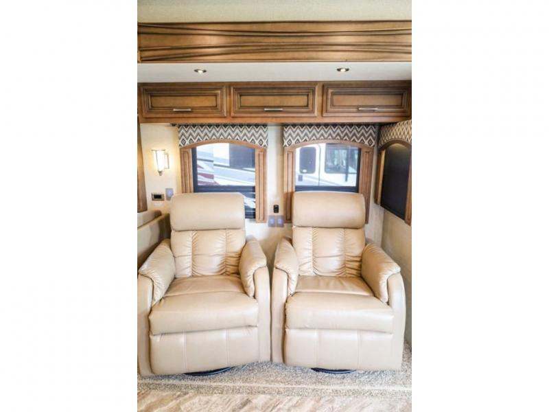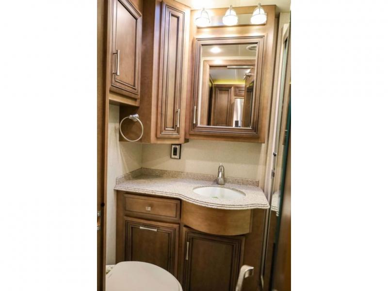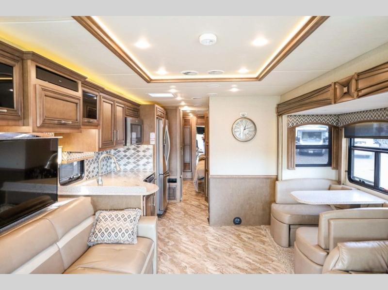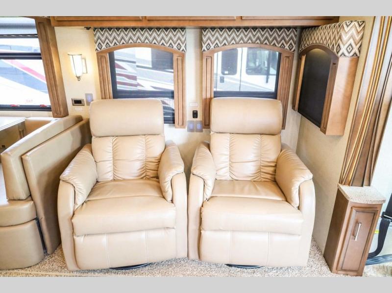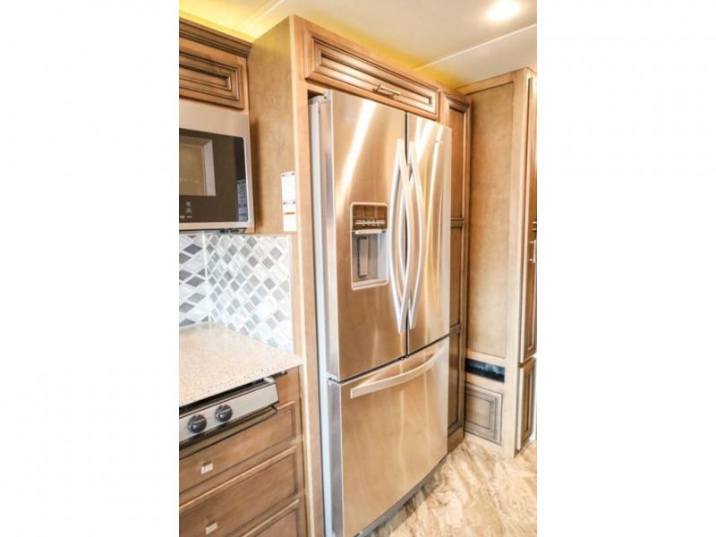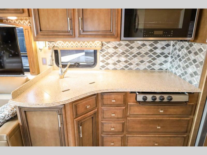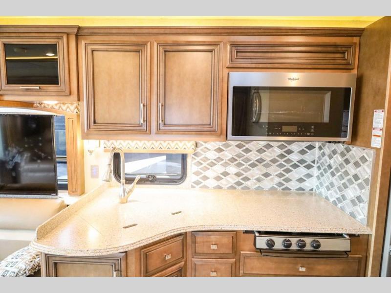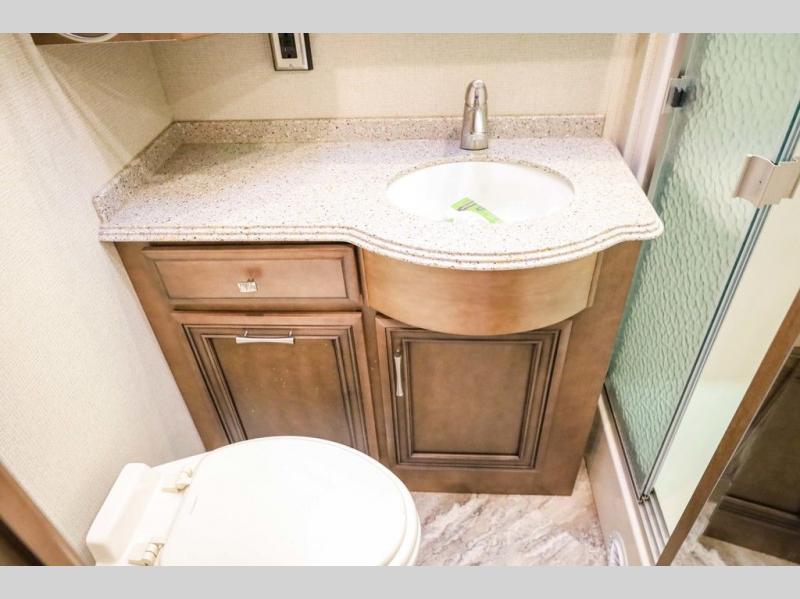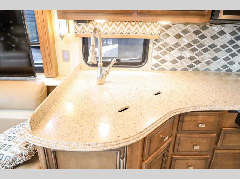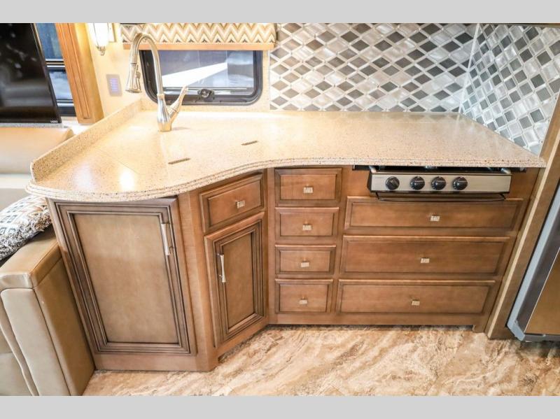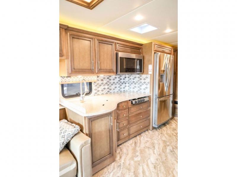 Each Canyon Star is built on a 26,000 lb. Ford F-53 chassis, and is ready to travel when you are! You can choose between two distinct exterior Masterpiece full paint finishes, two stylish interior colors, and three wood cabinet finishes. You can begin any journey from the comfort of the power adjustable driver's seat, while your traveling companion enjoys a footrest plus a stowable workstation. The galley has plenty of features from the polished solid-surface counter tops to the diamond pattern backsplash. In the kitchen you will also find a Norcold 10 cu. ft. refrigerator for your perishables and more! There is a USB charger at the passenger seat area and the dash for the driver. The road is calling your name, come answer that call with a Canyon Star!