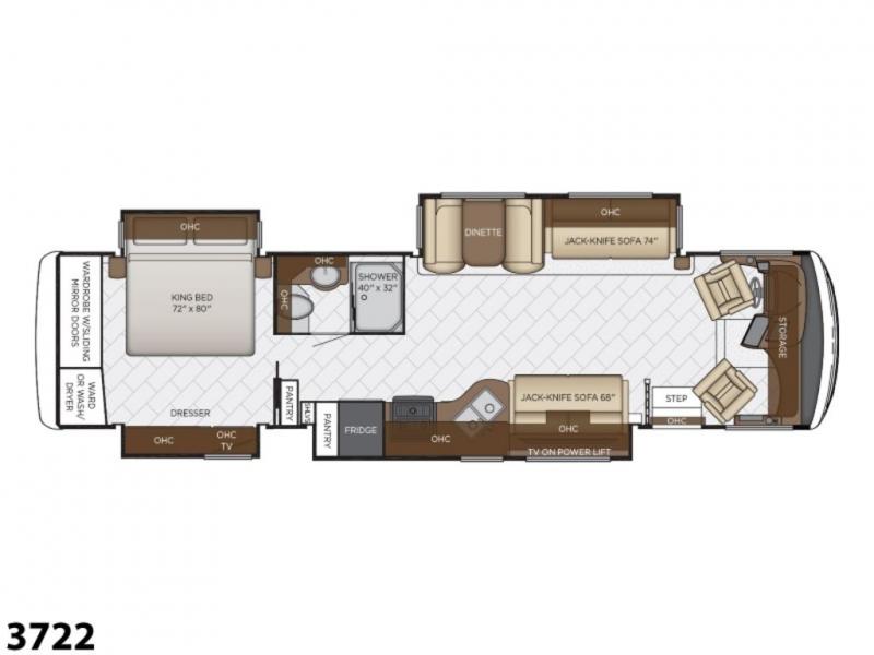 Whether your trip takes you across the country or to a quiet campground you will want this quad slide out Canyon Star 3722 class A motor home. With this model you can prepare your favorite meals in the spacious kitchen so you won't have to spend a lot of money eating out. From the 74" or the 68" jack knife sofas you can either watch TV, enjoy the view out of the windows, or visit with your family! When it is time to clean up then you will find an easy to use 40" x 32" shower, and in the rear bedroom come get a good night's rest on the king bed!