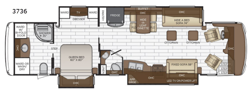 This Dutch Star 3736 motor home by Newmar features plenty of comforts throughout so you can enjoy your time away from home! In the living area there is a 74" hide-a-bed sofa and a 58" fixed sofa, plus the driver and passenger seats swivel around for added seating. Within the full wall slide out you will also find a hide-a-leaf table where you can eat your meals or linger a bit longer after dinner and play a card game or two. With a bath and a half your guests can use the half bath which is mid-coach and in the rear is where you will find the spacious master bath with a radius shower plus there is a wardrobe that has been prepped for a washer and dryer.