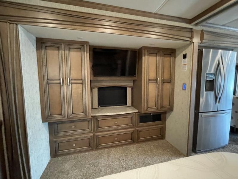 The Ventana 3709 class A diesel motor home by Newmar features a full wall slide out for the maximum amount of floor space. In the evening come relax and reminisce about your day at the 74" hide-a-bed sofa while enjoying a fire in the fireplace. A convenient half bathroom is located just before you come to the bedroom. In the rear of this model is the master bathroom with a radius shower and plenty of storage with a wardrobe plus an area that has been prepped for a washer and dryer!