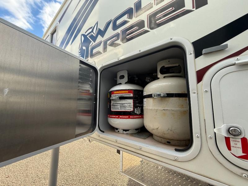 In any Northwood Wolf Creek, you will find a truck camper that is built to withstand off-road use without leaving behind any at home comforts. From the thick-wall aluminum frame construction, the one-piece corona treated, continuous fiberglass, and the high density foam block insulation with heated holding tanks to the beautiful solid wood cabinetry. You will also love interior features like the laminated flooring, the tinted, safety glass windows, and the interior command center. Along the exterior, you will enjoy convenient features such as the exterior shower, the LED lighting, 20 watt solar panel, and the 20k BTU auto ignition furnace with a digital thermostat, plus truck storage access doors and magnetic luggage door catches. Northwood has made it their business to bring you a relaxing, comfortable truck camper that is not only beautiful on the outside but quality built for years of enjoyment all year long. So, come choose the Wolf Creek that best suits you!