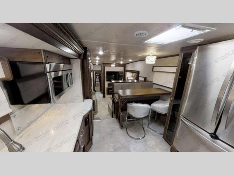 If you have been searching for a fifth wheel that has it all, stop looking. This Columbus offers a rear master bedroom complete with a pillowtop mattress, and a centrally located living area with an entertainment center that can be seen from the front kitchen. The kitchen includes plenty of counter space for preparing meals for everyone, a unique appliance garage and a bistro high-top dinette with chairs and a bench seating to mention a few "must have" features in your next fifth wheel. This unique floorplan also allows quick entry into the hallway across from the full bathroom, and easy access to the main living area. Stop searching, this is the one!