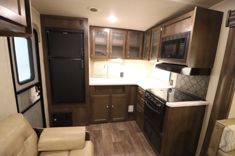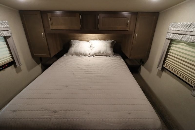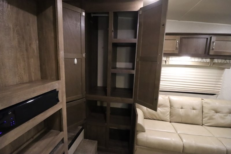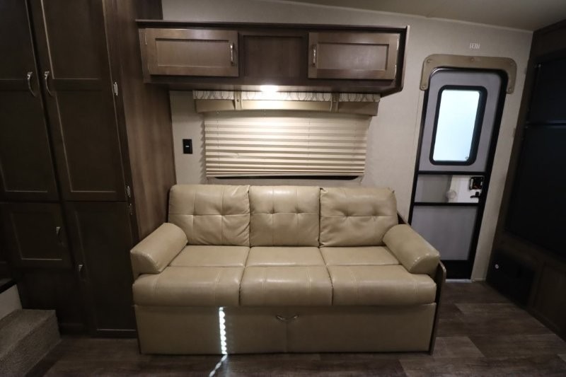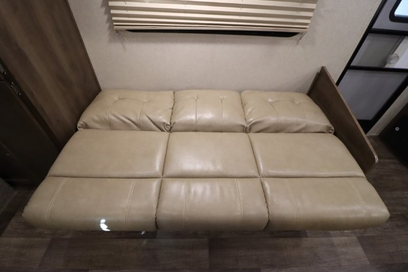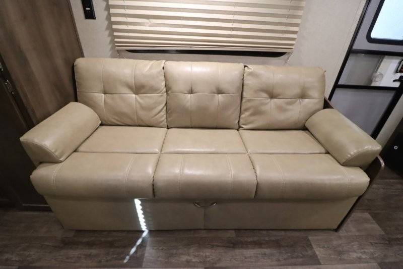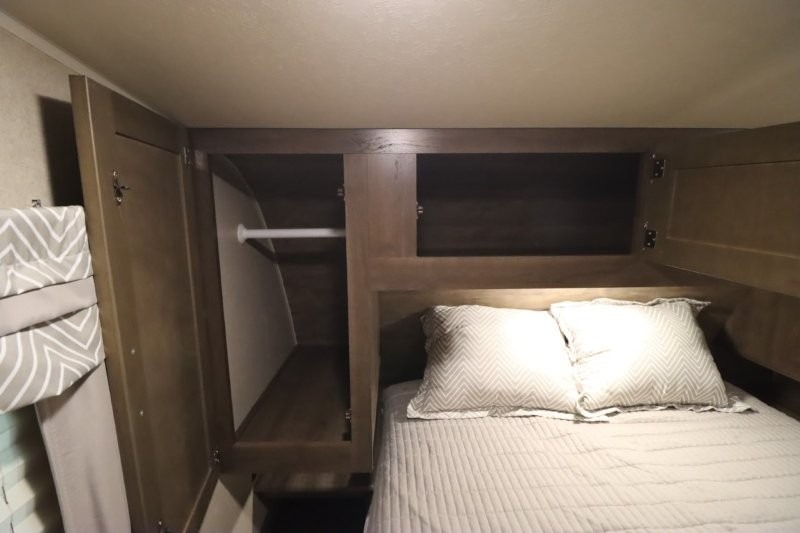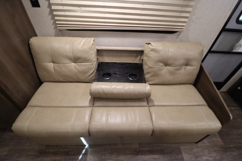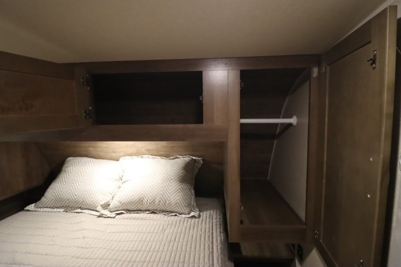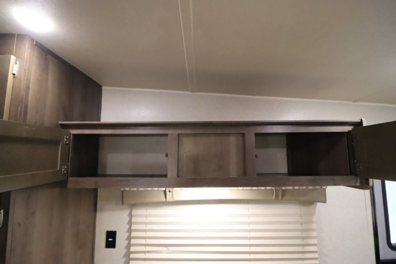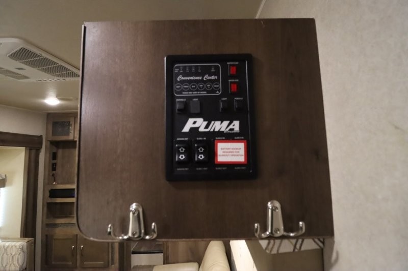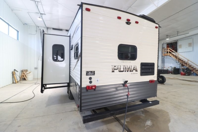 Can you picture yourself cooking in the rear kitchen or relaxing with other campers in the living area on chilly days? This Puma is perfect for a single person, a couple, or a family of five. The rear kitchen layout and furniture provide a great space to gather around after your daily adventure, plus the sofa and dinette slide out offers extra sleeping space. There is plenty of storage throughout with the closets, overhead cabinets and even includes a wardrobe between the bath and front bedroom. Plus, there is an exterior pass-through storage to keep your camping chairs and outdoor games, and an optional micro outdoor kitchen if you want to add that feature. Step inside!