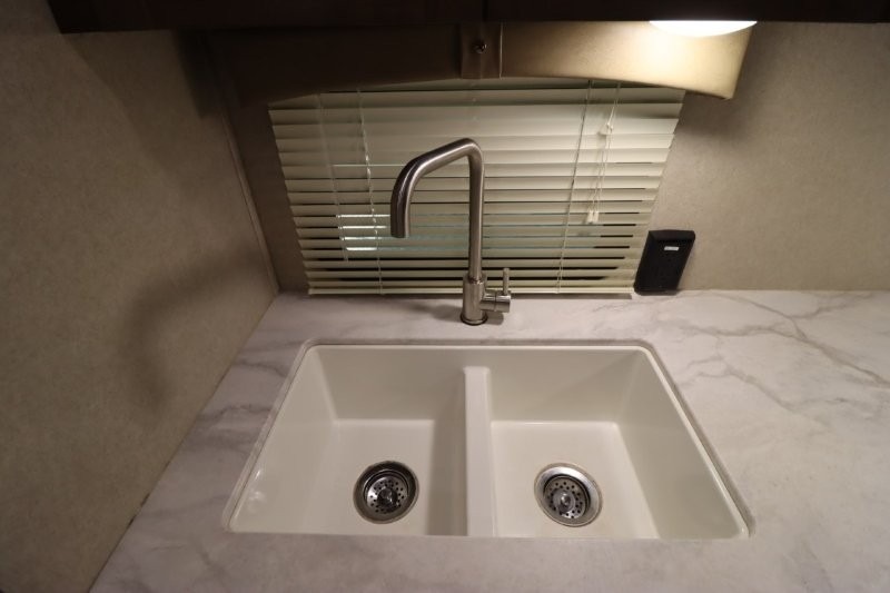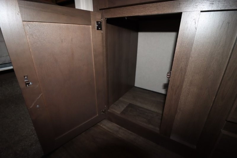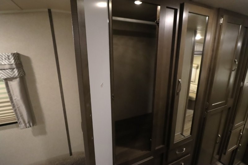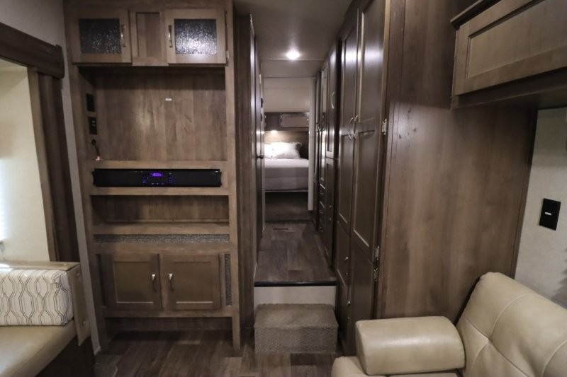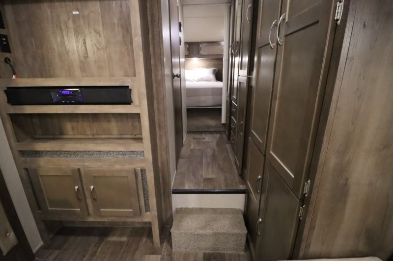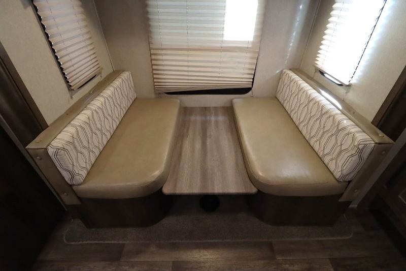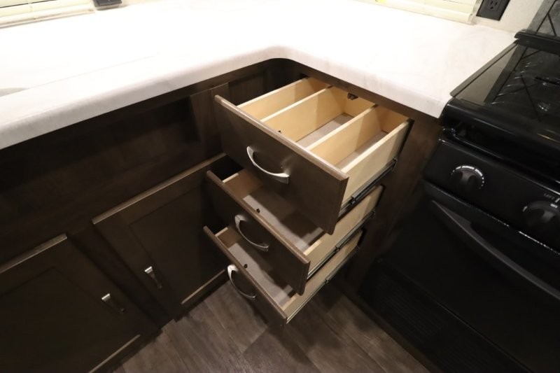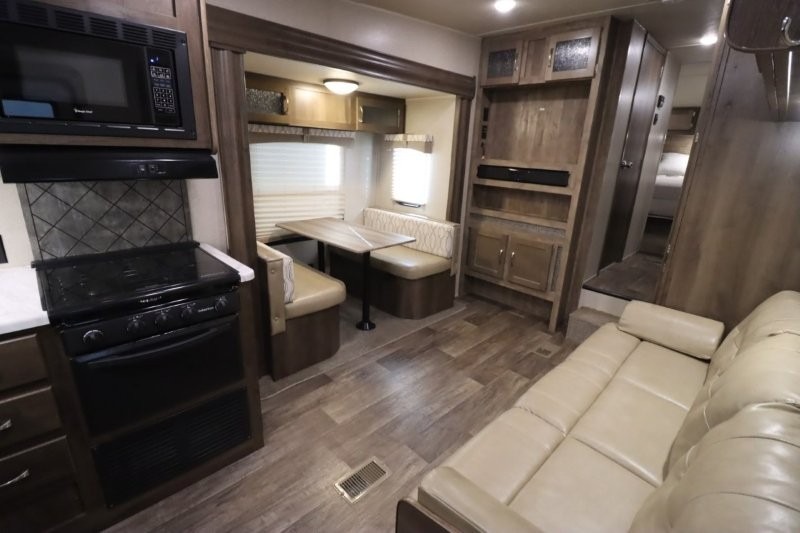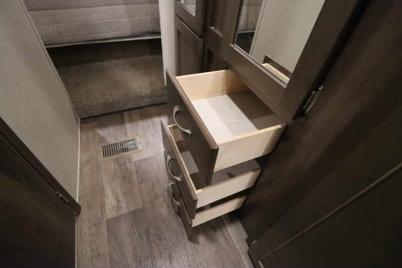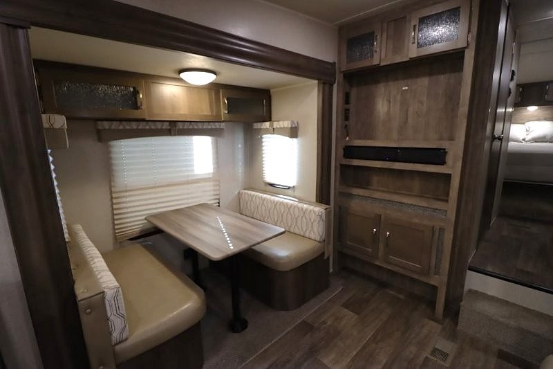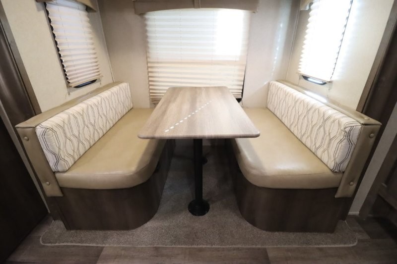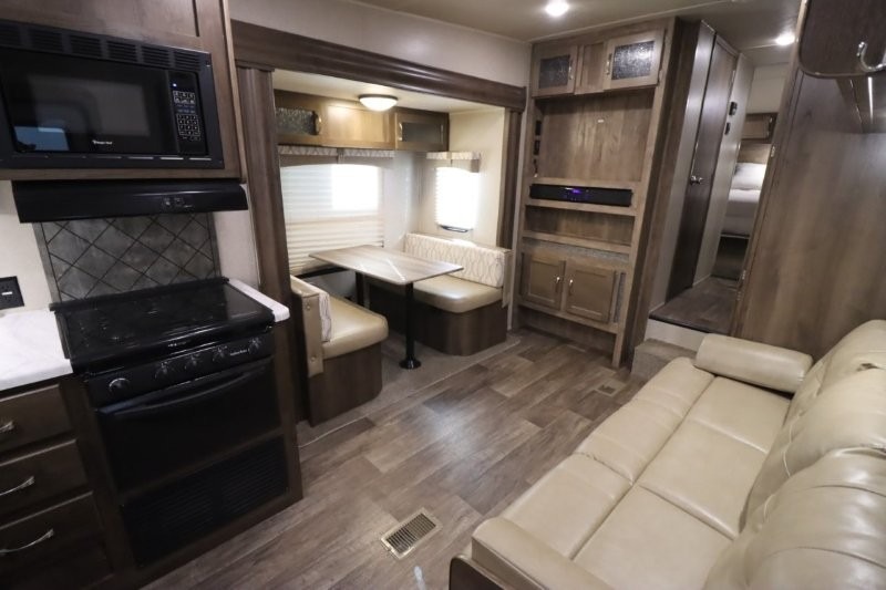 Can you picture yourself cooking in the rear kitchen or relaxing with other campers in the living area on chilly days? This Puma is perfect for a single person, a couple, or a family of five. The rear kitchen layout and furniture provide a great space to gather around after your daily adventure, plus the sofa and dinette slide out offers extra sleeping space. There is plenty of storage throughout with the closets, overhead cabinets and even includes a wardrobe between the bath and front bedroom. Plus, there is an exterior pass-through storage to keep your camping chairs and outdoor games, and an optional micro outdoor kitchen if you want to add that feature. Step inside!