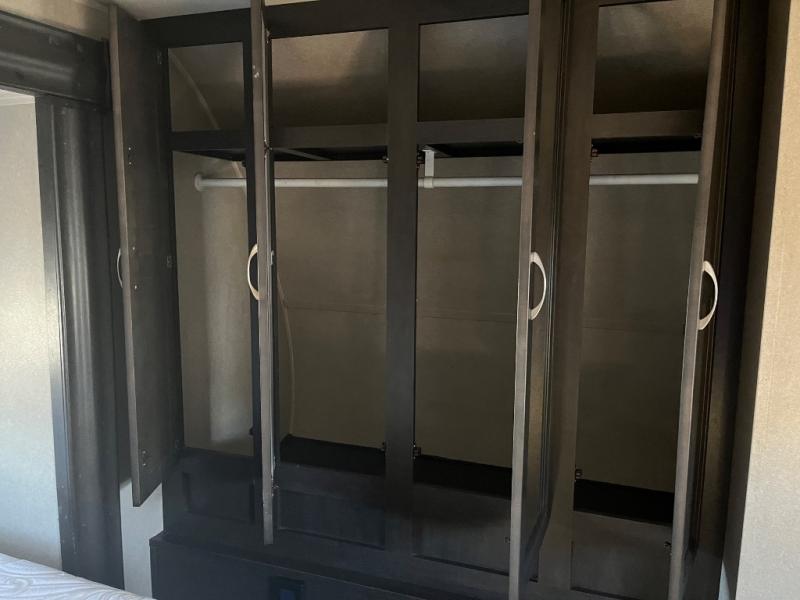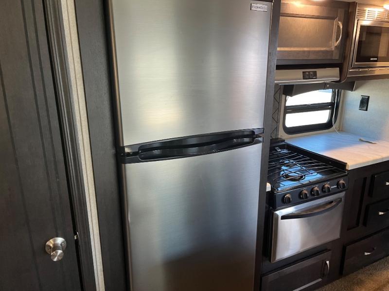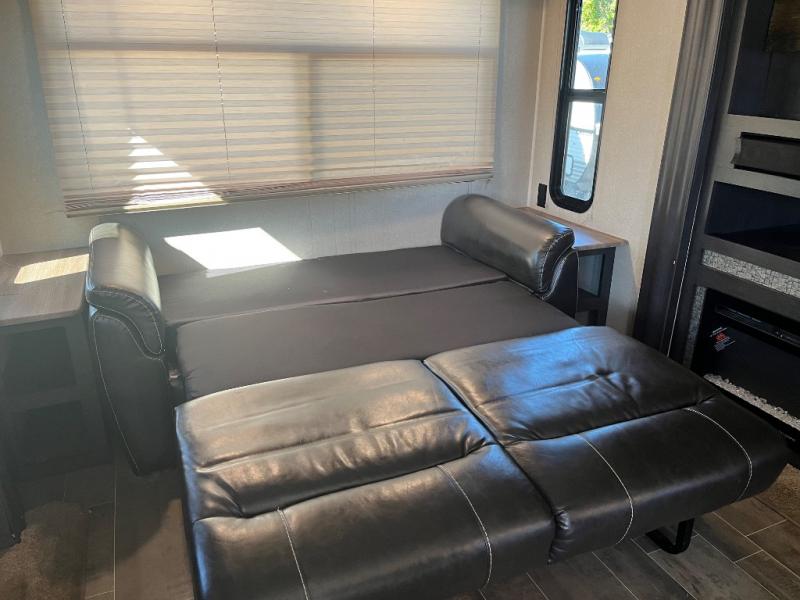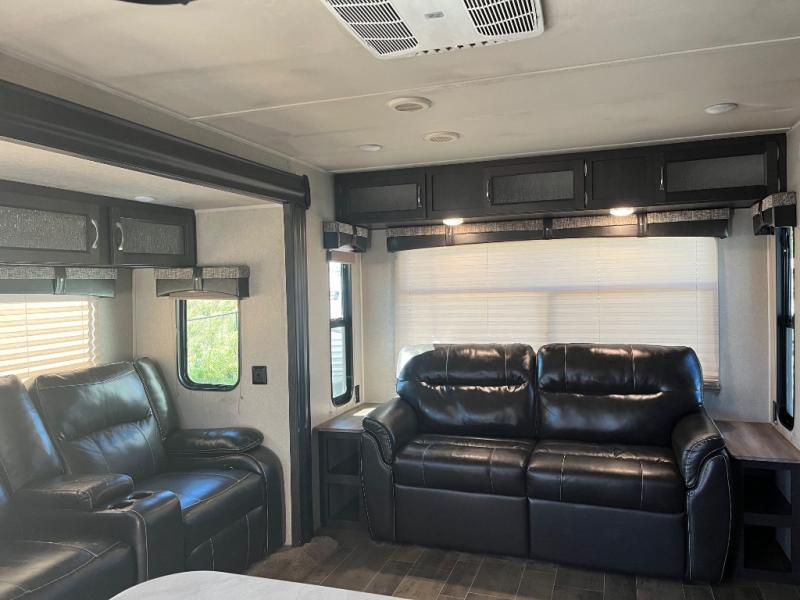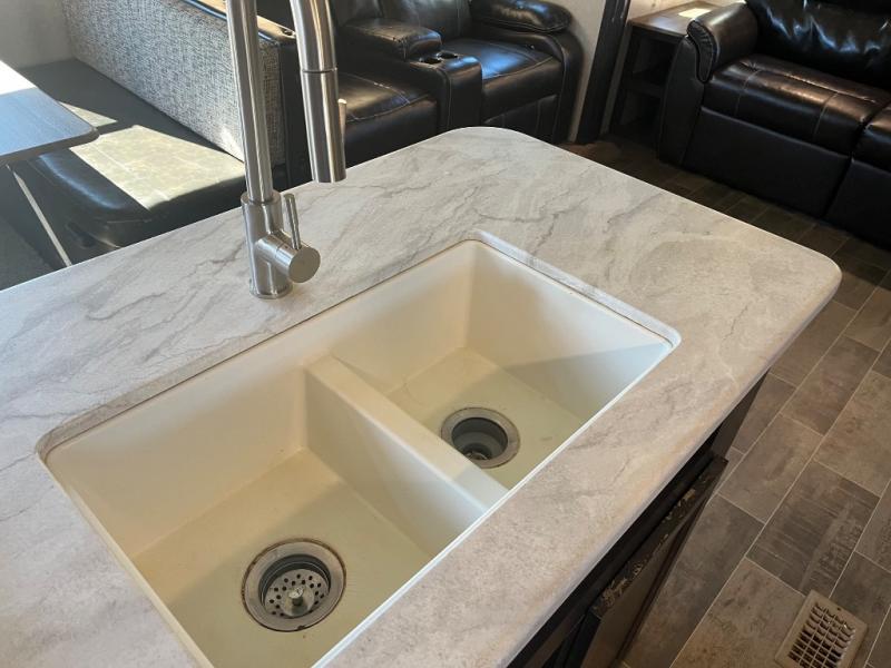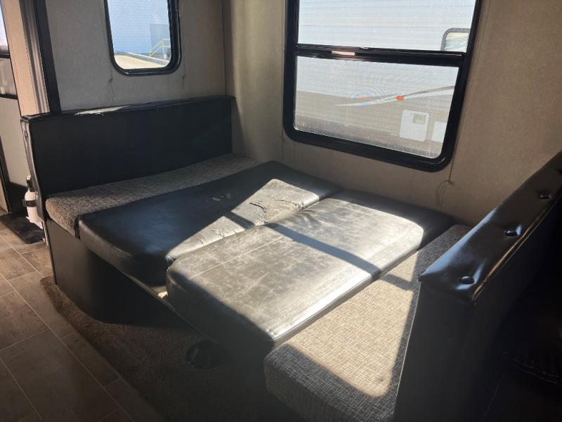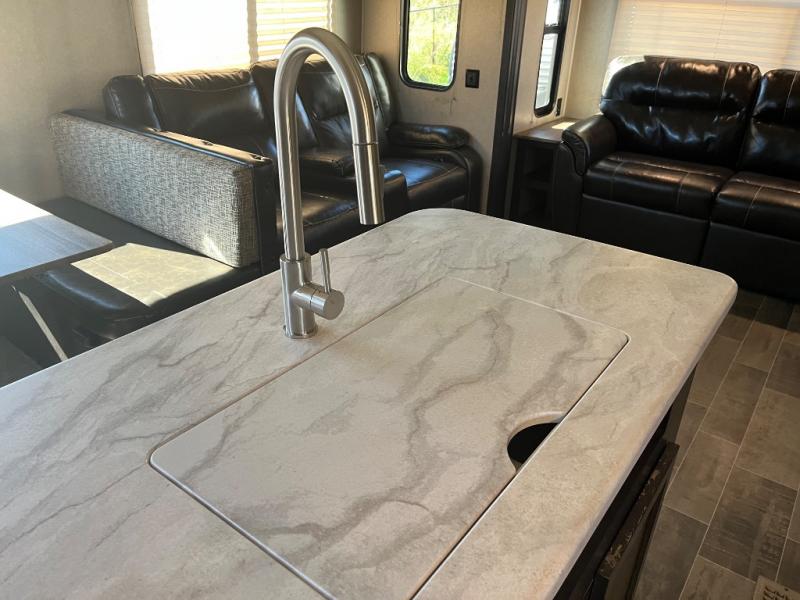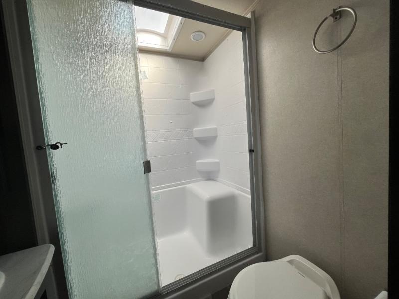 Imagine becoming a weekender or full-timer in this travel trailer. If you are single or married and love the wilderness, it is time to start traveling with the comforts of home anywhere you choose. The kitchen offers everything you need, like the kitchen island, to make meals and snacks and store your favorite camping snacks inside the walk-in pantry. You will find plenty of seating including two recliners, as well as the booth dinette and a sofa with end tables on either side. The bathroom even has a shower with seat, plus a linen closet to keep things neat and tidy. You can also choose to add a washer and dryer option if you like. Don't keep thinking about it, this is your time!
