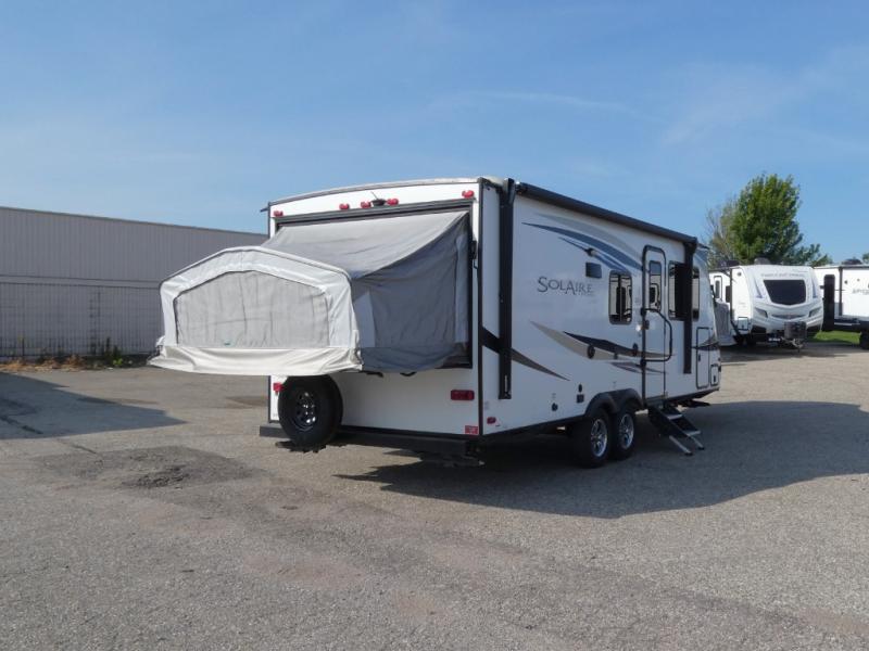 Because this SolAire Expandable comes with a U-shaped dinette and three queen tent beds, it is able to sleep eight people comfortably. In the kitchen, the 8 cubic foot refrigerator and three-burner cooktop allow you to prepare a breakfast feast big enough to feed all of those sleeping guests. The kids will love eating their breakfast every morning at the counter with stools.
