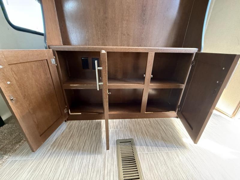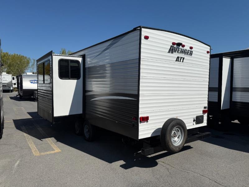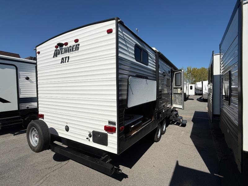 Imagine the kiddos hiking around the campground and laughing about their adventures in this Avenger ATI travel trailer. This trailer offers sleeping accommodations for eight because of the double-size bunks, U-shaped dinette, and queen-size bed, and it also includes a full bathroom with a shower curtain on a curved track providing more elbow room. You will find full kitchen amenities inside, as well as an outdoor kitchen where you can watch the kids play while making dinner. The single slide provides more living space on the interior, as well as extra sleeping space.