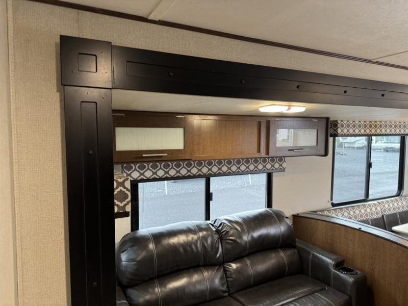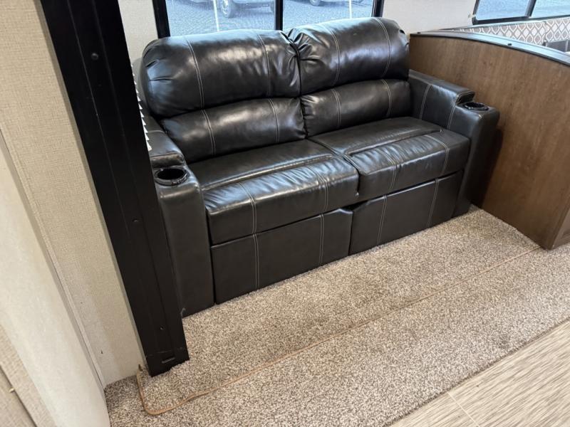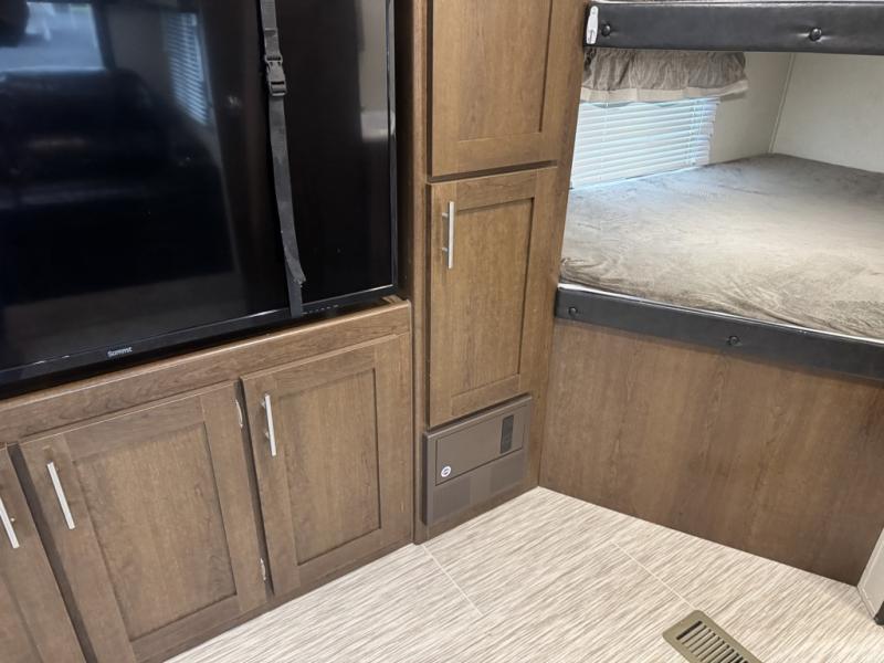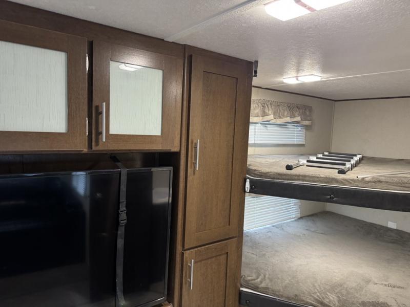 If you are a growing family that enjoys the comforts of home while away exploring at a state park, then you need this Avenger ATI travel trailer. You are sure to enjoy the entertainment center and 50" LED TV, and the outdoor kitchen will be helpful as you visit with other campers and watch your kids play. From the U-shaped dinette and sofa, to the queen-size bed in the private bedroom and double-size bunks, you will have plenty of space to sleep ten people.