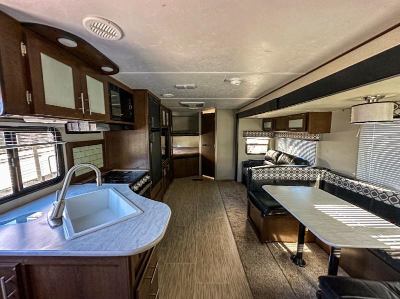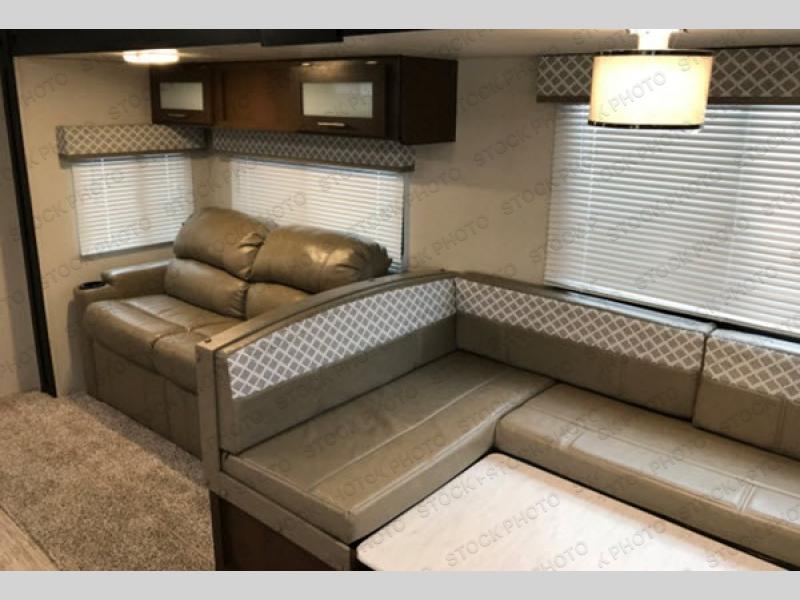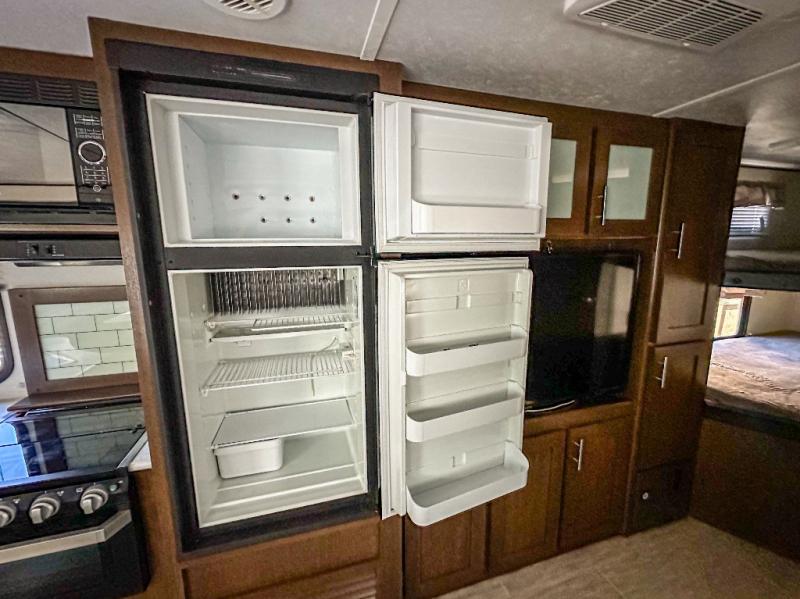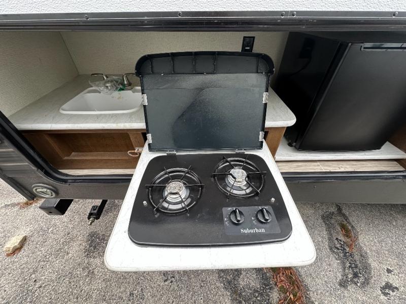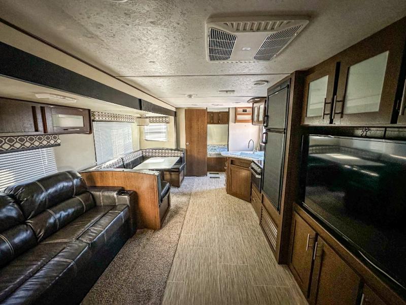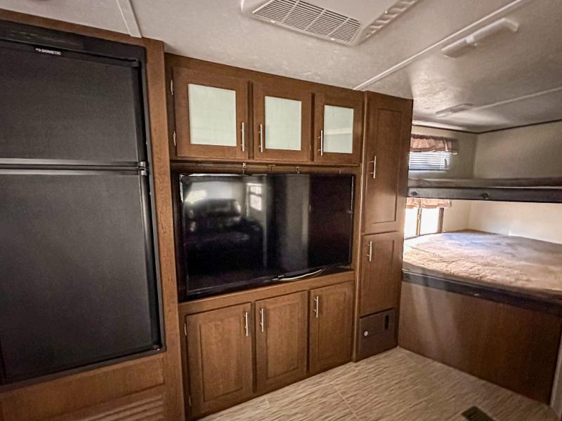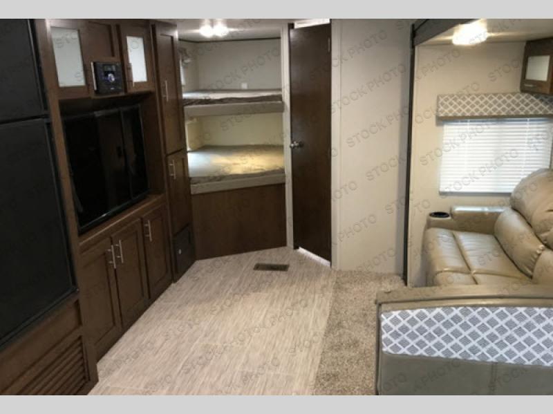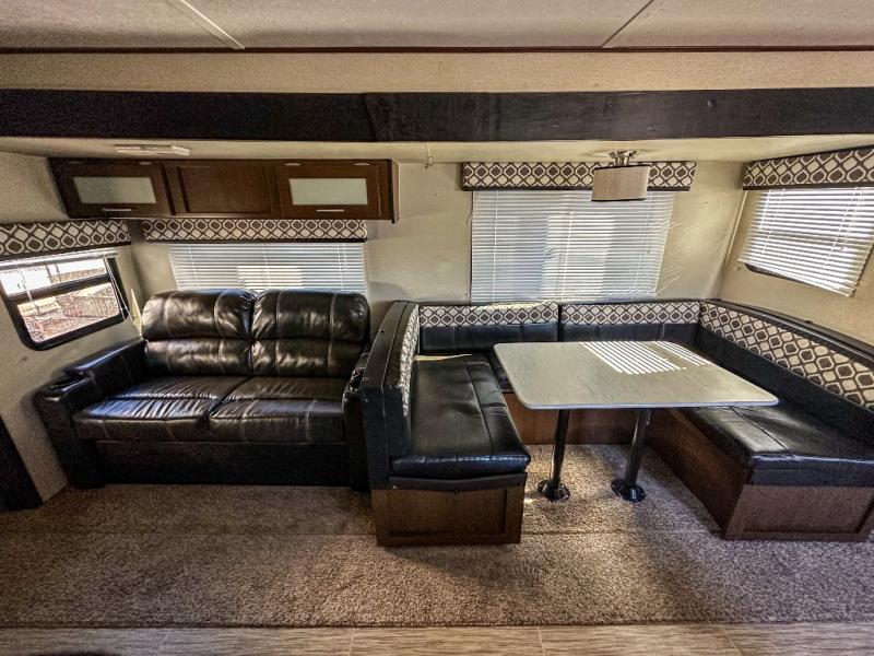If you are a growing family that enjoys the comforts of home while away exploring at a state park, then you need this Avenger ATI travel trailer. You are sure to enjoy the entertainment center and 50" LED TV, and the outdoor kitchen will be helpful as you visit with other campers and watch your kids play. From the U-shaped dinette and sofa, to the queen-size bed in the private bedroom and double-size bunks, you will have plenty of space to sleep ten people.