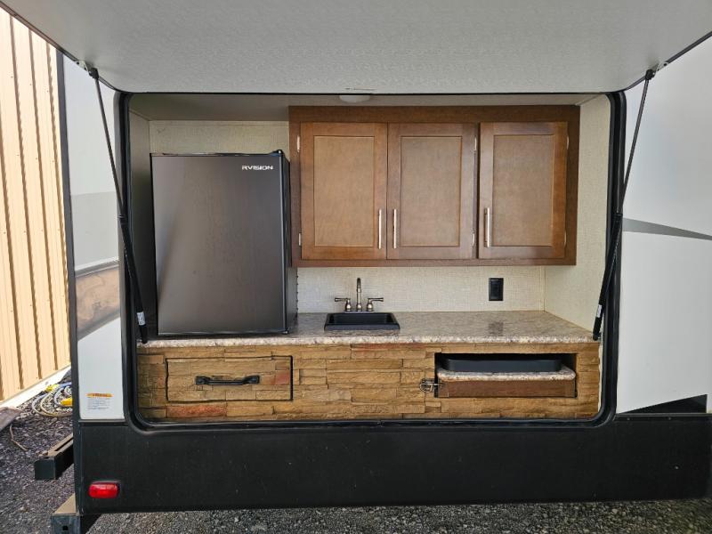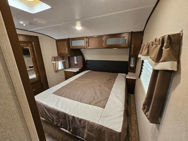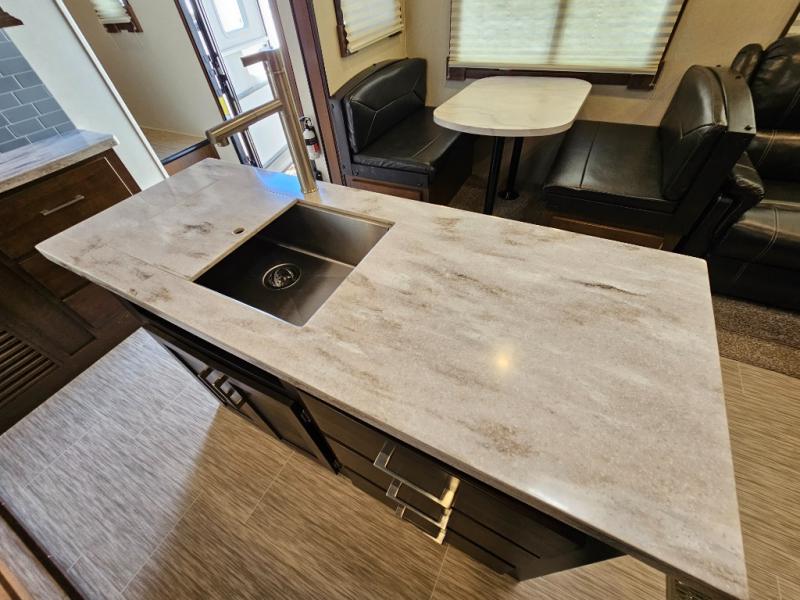 Traveling across the country in this Crusader fifth wheel will be your family's new favorite vacation getaway because of all of the stylish and comfortable amenities it provides. With enough space to sleep seven people, you won't feel crowded as you drift off to sleep each evening, and the four slides that have been included in this unit allow for extra items, like the outdoor kitchen and large kitchen pantry, to be added.