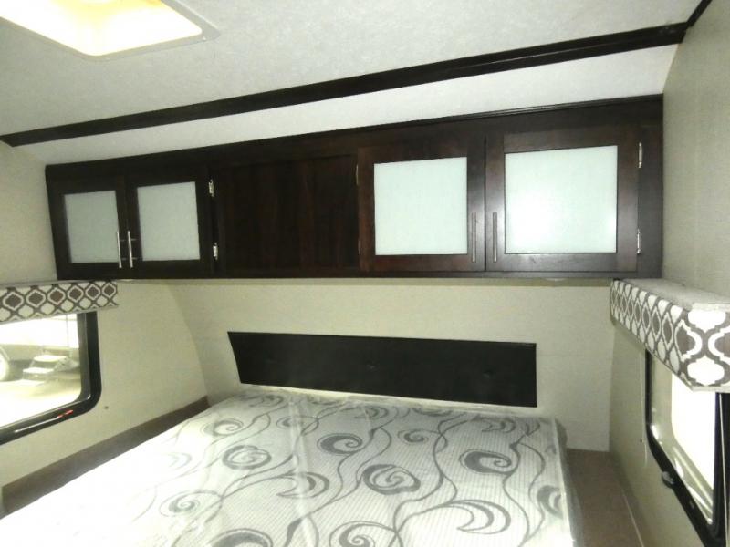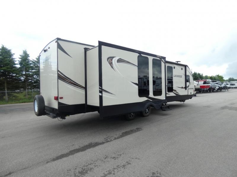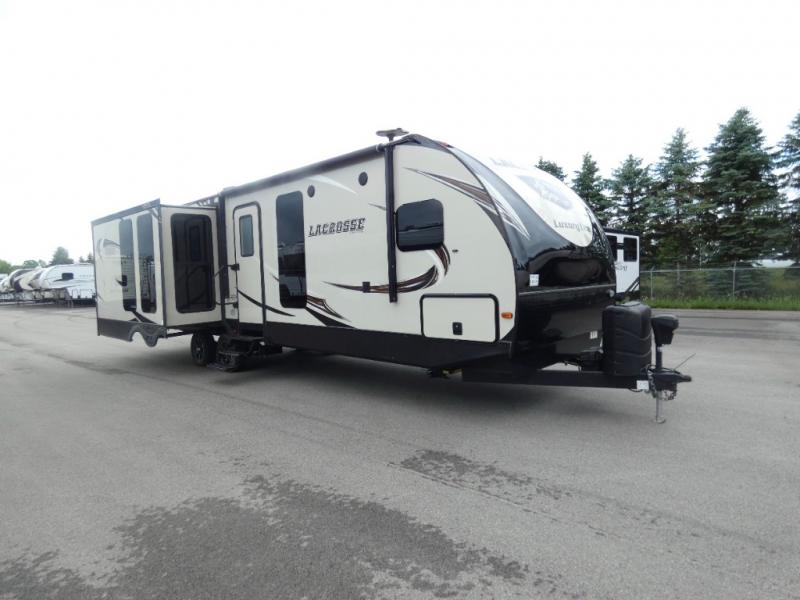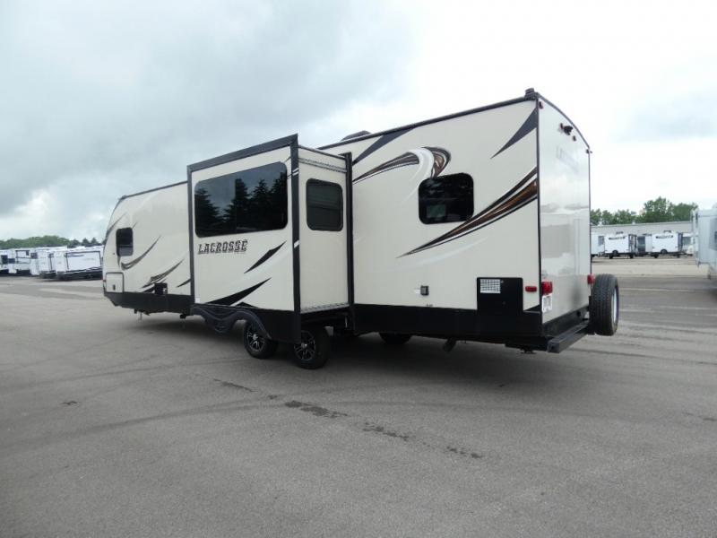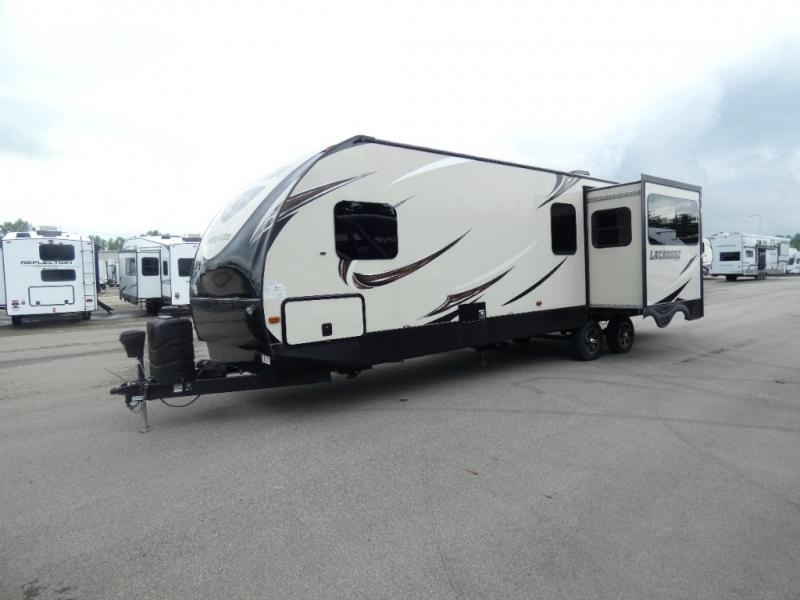 Wherever your camping adventures lead you, you will want a luxury LaCrosse travel trailer. Throughout each model you will find attention to detail from the shaker style cabinet doors, single bowl stainless steel sink, and residential J-spout kitchen faucet to the "One Touch" electric awning. You will find upgraded residential carpet with a pad, and in the living room there is an exclusive oversized MAX slide out offering nearly 40 cu. ft. of additional living space. MAX protection is found in the exclusive ETERNABOND construction which includes an enclosed and heated underbelly plus heated holding tanks and more. The mandatory Advantage Package includes the following - Universal Docking Center, electric tongue jack, a Furrion residential cooktop, solid surface countertops, a large stainless steel refrigerator, and so much more!
