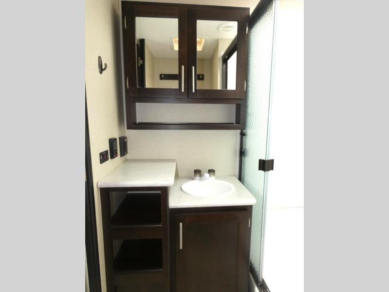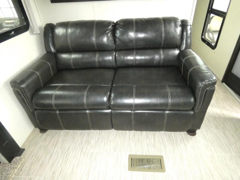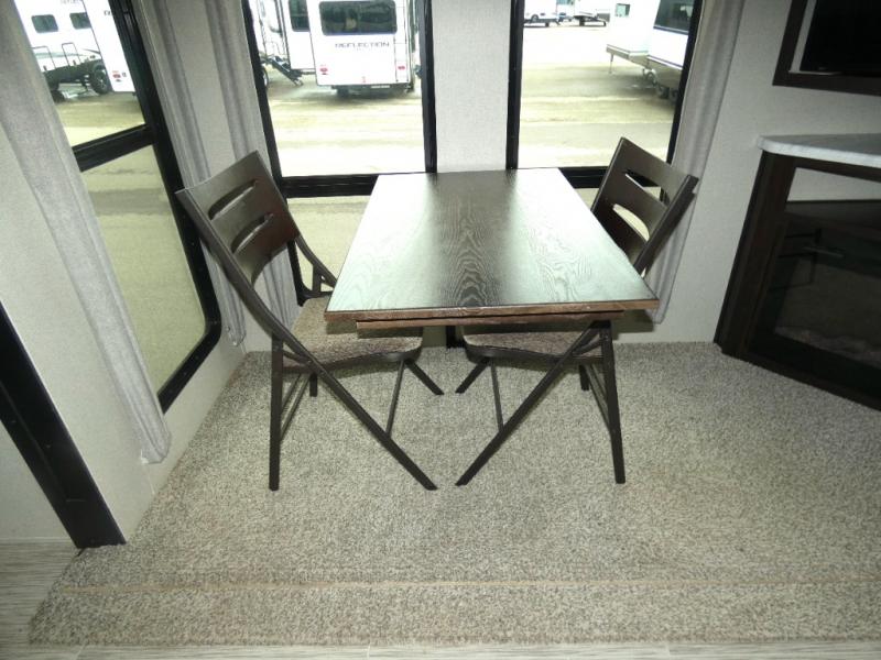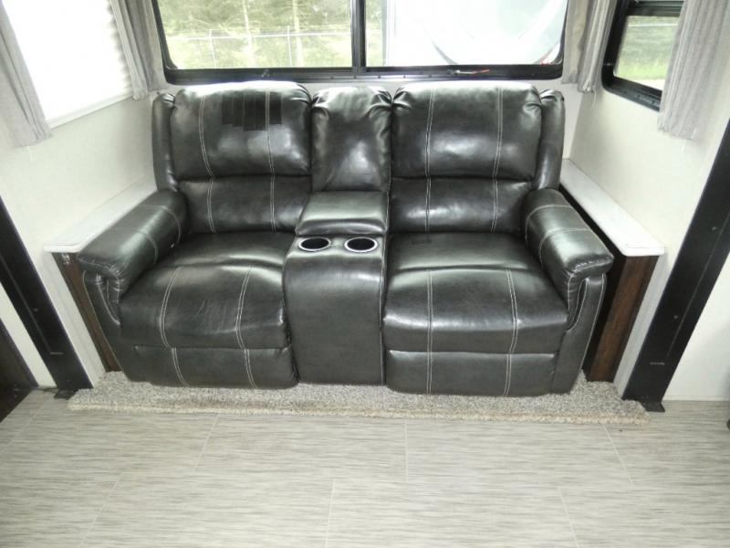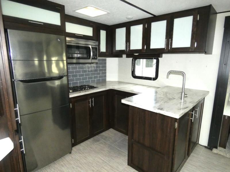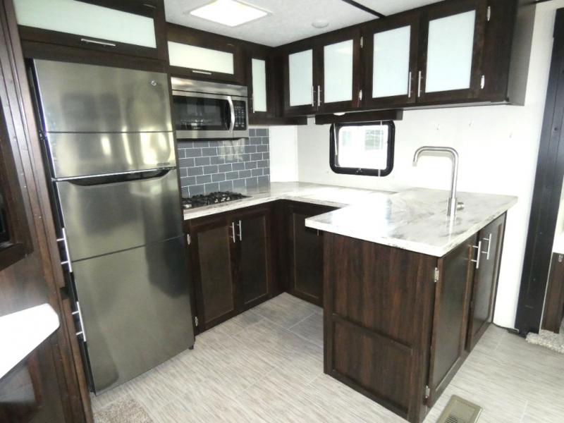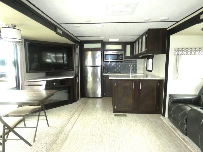 Come find yourself longing for your next camping trip when you have this unique rear kitchen in the LaCrosse travel trailer. Your meal prep will be a breeze with the U-shaped counter, and you will have plenty of space for your cold items in the stainless steel 11 cu. ft. refrigerator. You will find additional MAX storage throughout including in the oversized pots-n-pans drawer and oversized pantry with adjustable and removable shelves. When it's time to unwind inside, the theater seats and sofa are available to watch the 50" LED TV and stay cozy from the fireplace, or you can relax outside under the awning. When you are ready to turn in for the night then retreat to the private front bedroom with a king size bed and plenty of clothing storage, plus there is a location to add an optional washer and dryer if you like. Check this model out to find luxury and comfort around every corner!