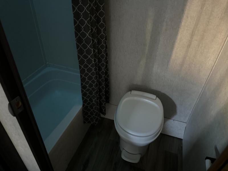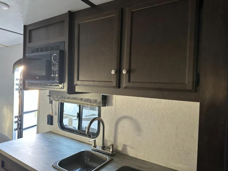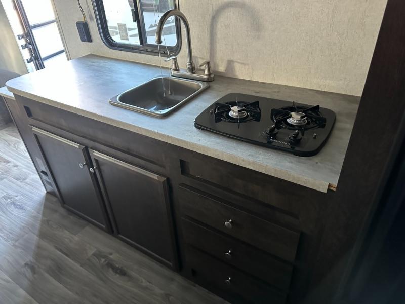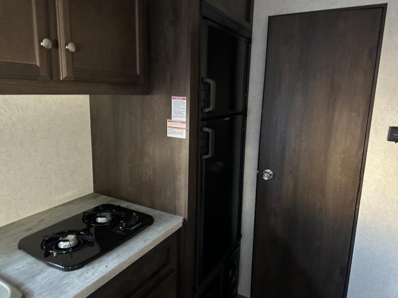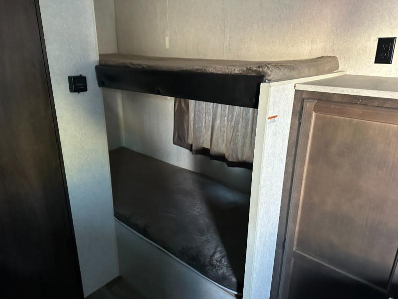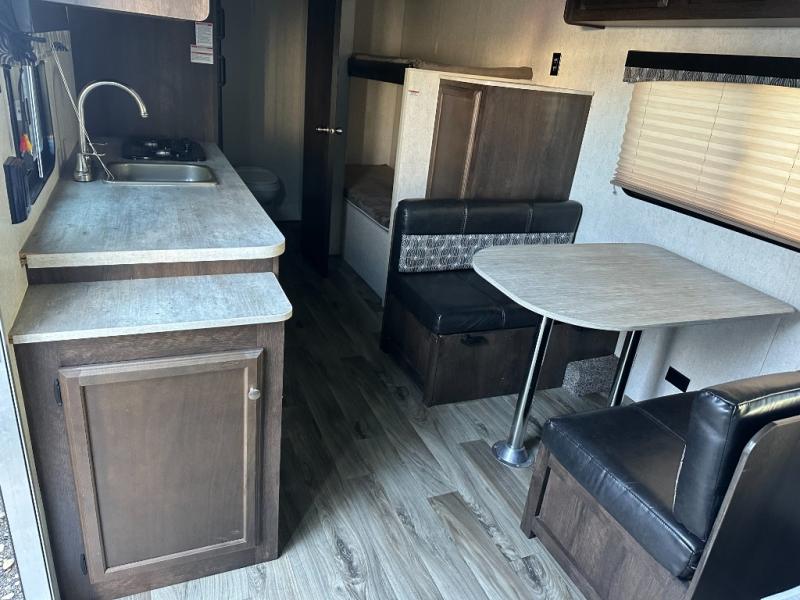 You are going to love the functionality and convenience of this 20BH Autumn Ridge Outfitter travel trailer! With a rear set of bunk beds for your kids, a front queen bed for mom and dad, and a dinette which can easily convert into additional sleeping space you can accommodate a family of six. The rear bathroom has a tub/shower and a toilet for your convenience. Between the bunk beds and the dinette there is a large pantry for all of your canned goods.