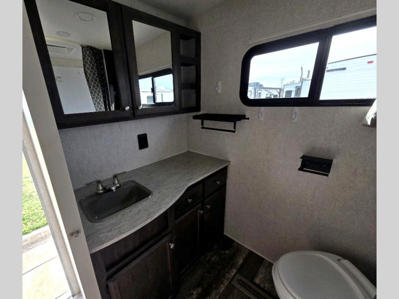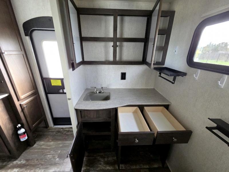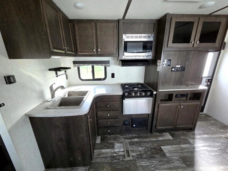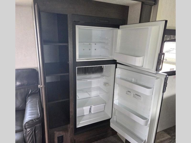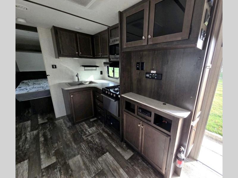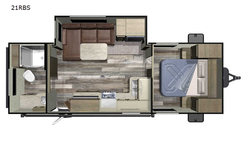 Are you ready for a little rest and relaxation? Then come camp with this 21RBS Autumn Ridge Outfitter travel trailer and enjoy all of the space inside! You can not only prep your meals with ease in the kitchen, but also clean up in a breeze with the double sink and residential-style high rise faucet, plus you will have plenty of room in the 6 cu. ft. refrigerator to store your delicious leftovers. You can also comfortably enjoy your meals on the L-shaped sofa with a table or use it for an afternoon nap area. Don't leave behind any of your favorite camping accessories, simply store them in the overhead cabinets. When you're ready to hit the sack, head into the front private bedroom and enjoy a good night's rest on the queen bed which even has a bedspread ready for you!