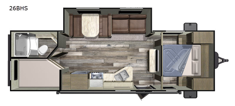 You can take the whole gang camping in this Autumn Ridge Outfitter travel trailer. Model 26BHS features a set of double bunk beds, where there is sleeping space for four people so you can camp with a guest or two! You will appreciate the spacious interior thanks to the slide out along the roadside and within the slide out there is a booth dinette for you to enjoy your meals at. Plus a sofa where you can relax after playing outdoors. At night, you will want to retreat to the front bedroom where you will find a comfortable queen bed and closets on either side so that you can be dressed your best. There is also an entertainment center big enough for all to enjoy!