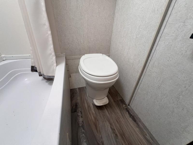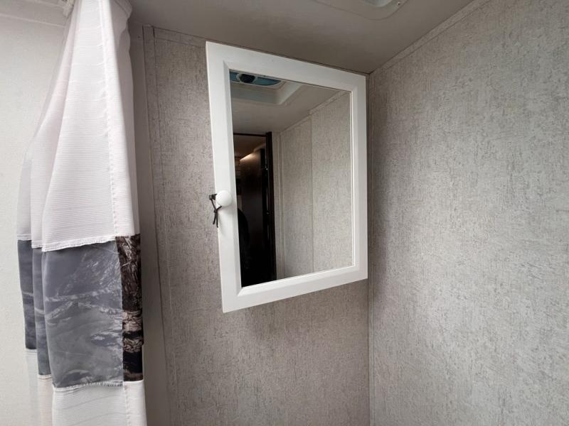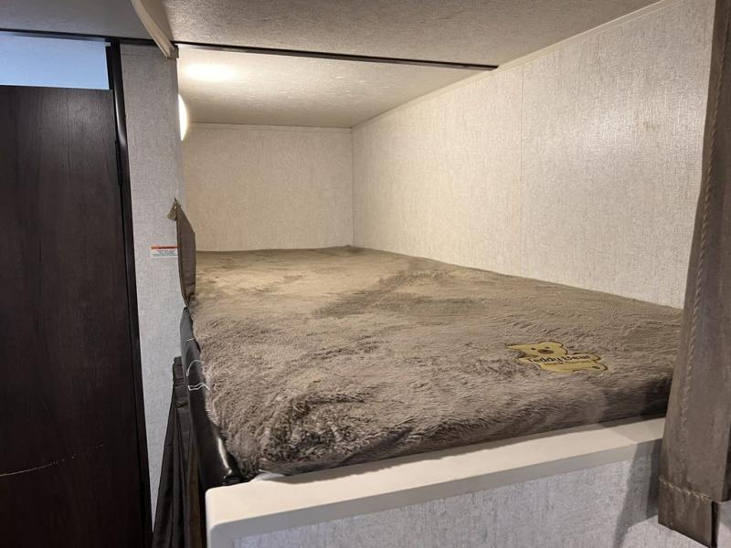 Enjoying a shower after a hunt or fishing outing can be refreshing before bedtime. The kids can then choose their bunk for the night while you sleep on the front bed, and one more person can sleep on the dinette if needed. The slide out dinette also offers more floor space to move around, and a place to play cards if its raining outside. The cook can make any meal in the full kitchen, and you can store your gear in the exterior compartments or in several locations inside. Someone might even choose to relax under the power awning with LED lights and speakers before calling it a night.