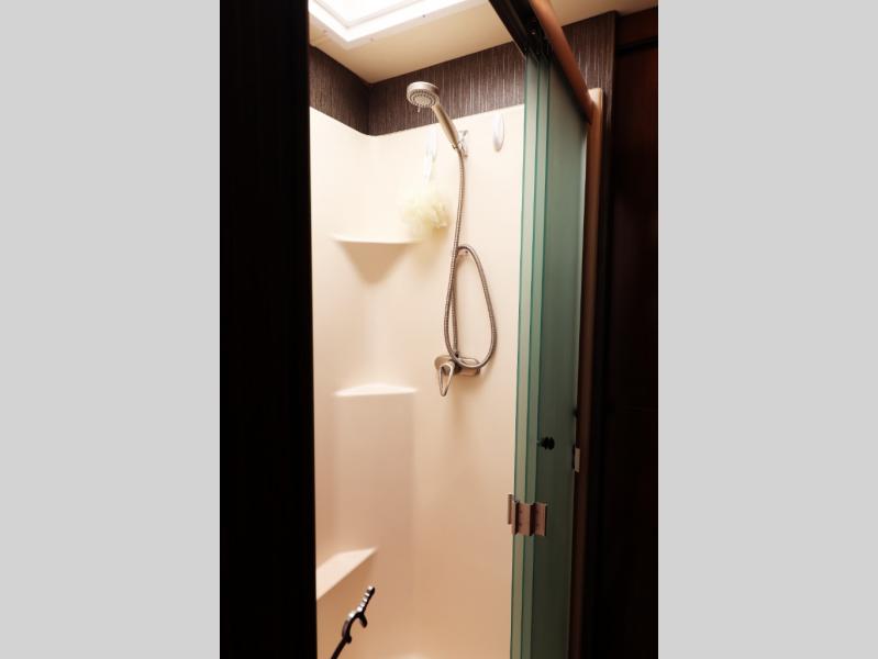 Sleek full-body gel-coat fiberglass with Sapphire full-body paint, frameless dual-pane windows, slide-out toppers and powerful lateral-arm patio awnings with integrated LED lighting.