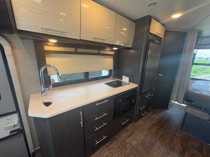 Get ready to set out to new destinations in a Compass Class C diesel motorhome. Along the exterior portion of the Compass you will find a Vacu-Bond laminated roof, walls, and floors with block foam insulation. Your extra camping gear can be stored in the Rotocast storage compartments with lights, and there is a power patio awning with integrated LED lights which will allow you to sit outside just a bit longer each night. The interior decor of the Compass has a modern and classy look with its residential vinyl flooring, Euro-style cabinet doors, and pressed laminate countertops.