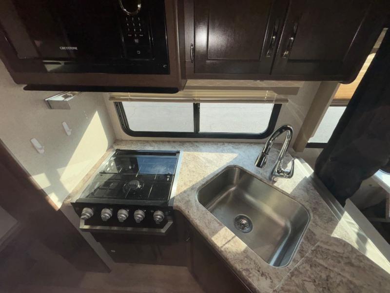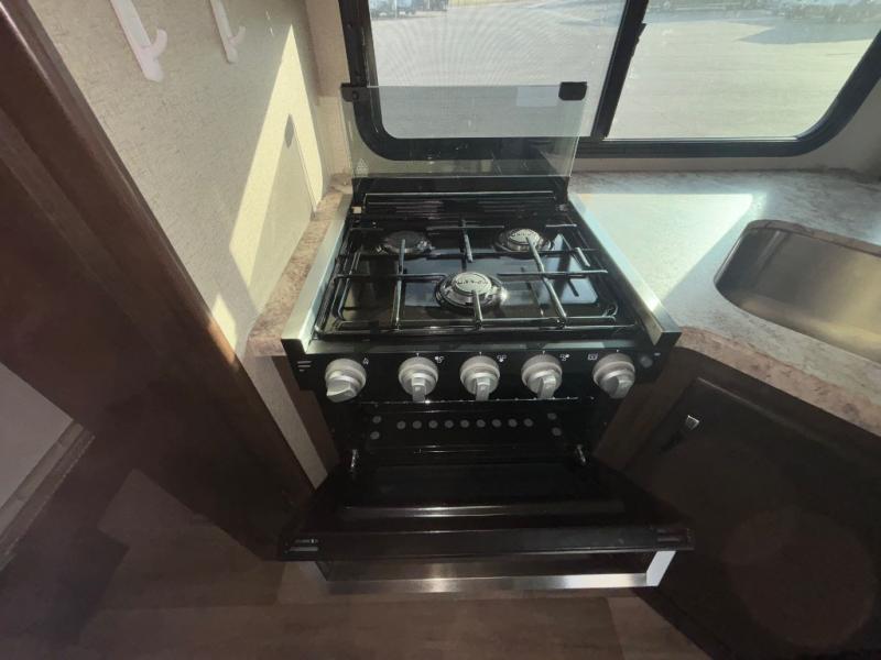 Along the roadside, there is a 71" Dream Dinette where you can enjoy your meals. At night the dinette easily converts into additional sleeping space, if needed. Above there is an overhead cabinet. The kitchen area features an angled sink, overhead microwave, three burner range, overhead cabinet, and a pantry for your canned goods.