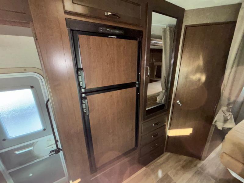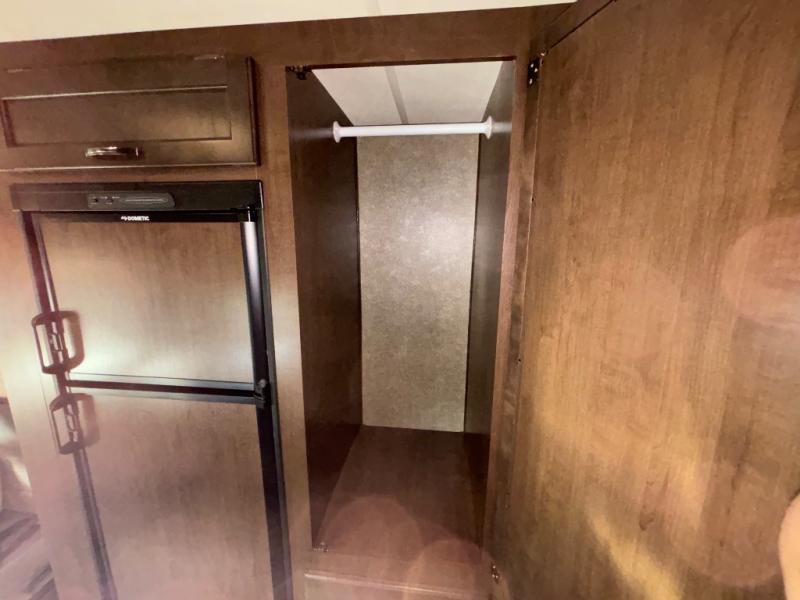 To the right of the entry door, there is a 68" jack-knife sofa which also features an overhead cabinet plus two sets of seat belts which are sure to come in handy as you travel. To the left of the door, there is a broom closet, a refrigerator, and a closet.