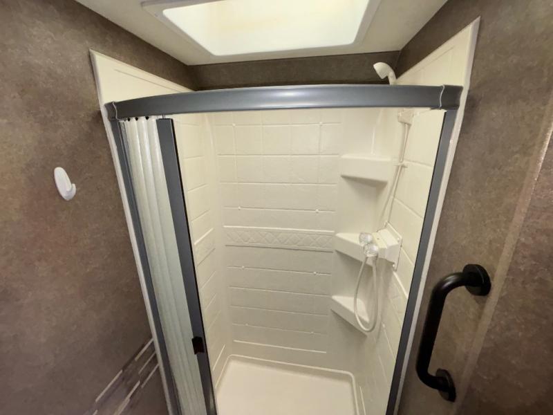 The bathroom is in the rear left corner of this model. Here you will find a sink, medicine cabinet, toilet, and a 24" x 36" shower, plus so much more!