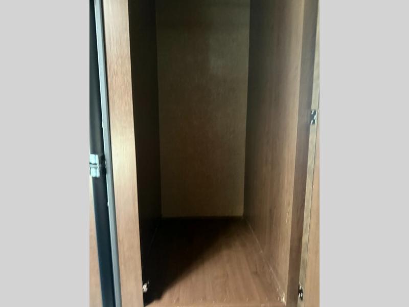 To the right of the entry door, there is a 68" jack-knife sofa which also features an overhead cabinet plus two sets of seat belts which are sure to come in handy as you travel. To the left of the door, there is a broom closet, a refrigerator, and a closet.