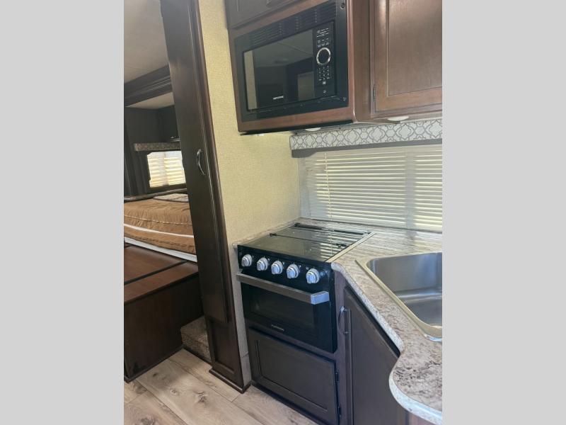 After a day of fun an adventure retreat to the comfort of the rear bedroom. Here you will find a slide out with a queen bed, an overhead cabinet, and nightstands. There is also a privacy curtain which you can easily pull closed at night.