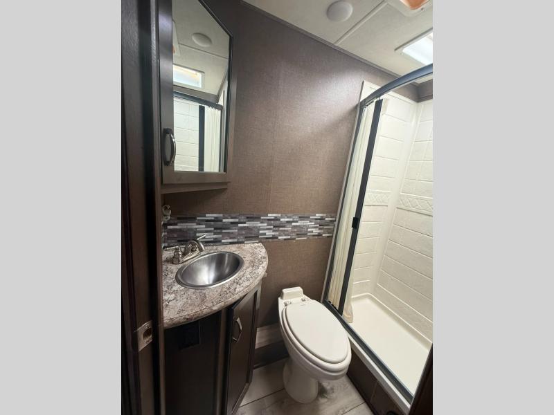 The bathroom is in the rear left corner of this model. Here you will find a sink, medicine cabinet, toilet, and a 24" x 36" shower, plus so much more!