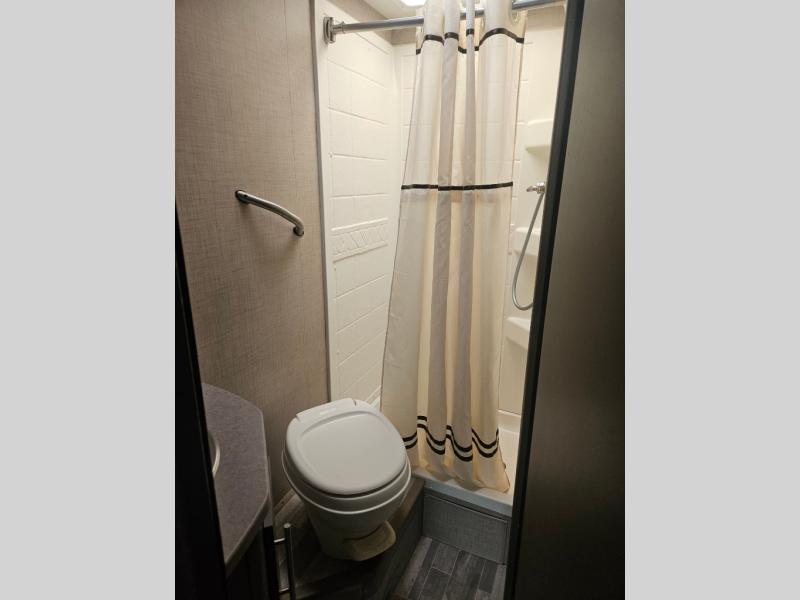 Get ready to set out to new destinations in a Gemini Class C diesel motorhome. Along the exterior portion of the Gemini you will find a Vacu-Bond laminated roof, walls, and floors with block foam insulation. Your extra camping gear can be stored in the Rotocast storage compartments with lights, and there is a power patio awning with integrated LED lights which will allow you to sit outside just a bit longer each night. The interior decor of the Gemini has a modern and classy look with its residential vinyl flooring, Euro-style cabinet doors, and pressed laminate countertops.