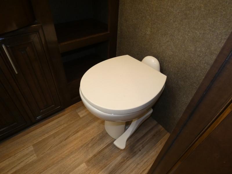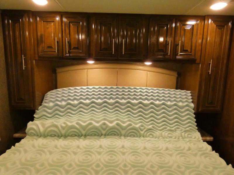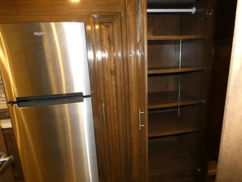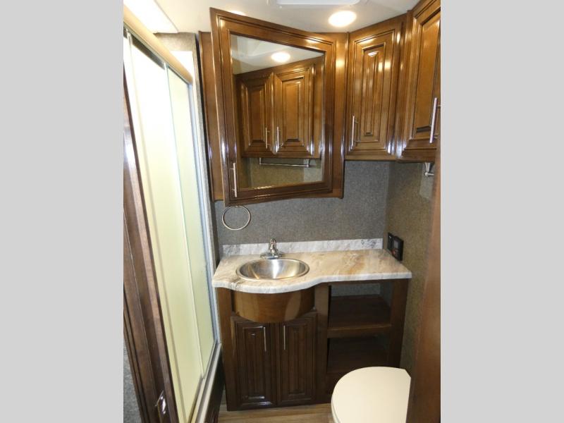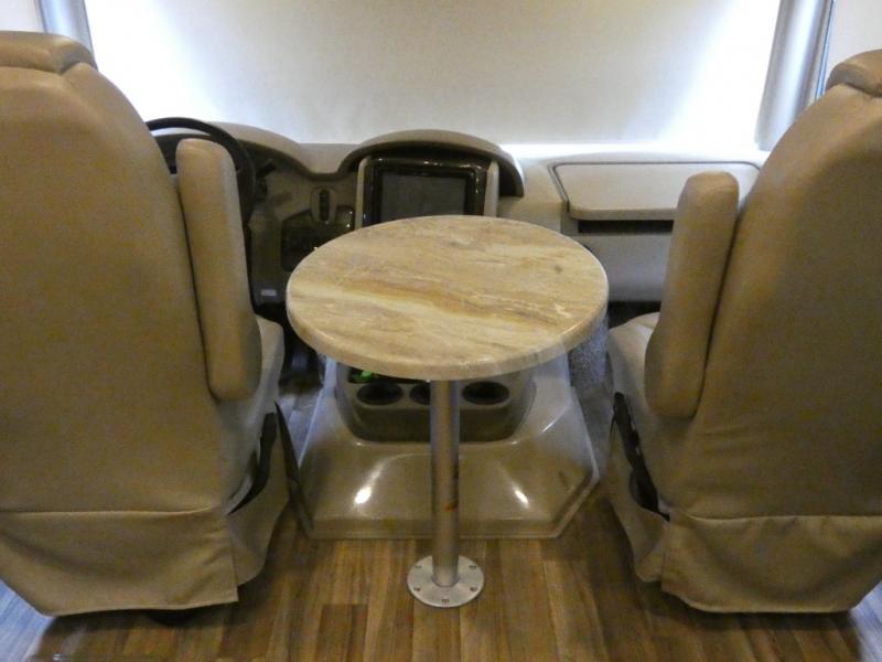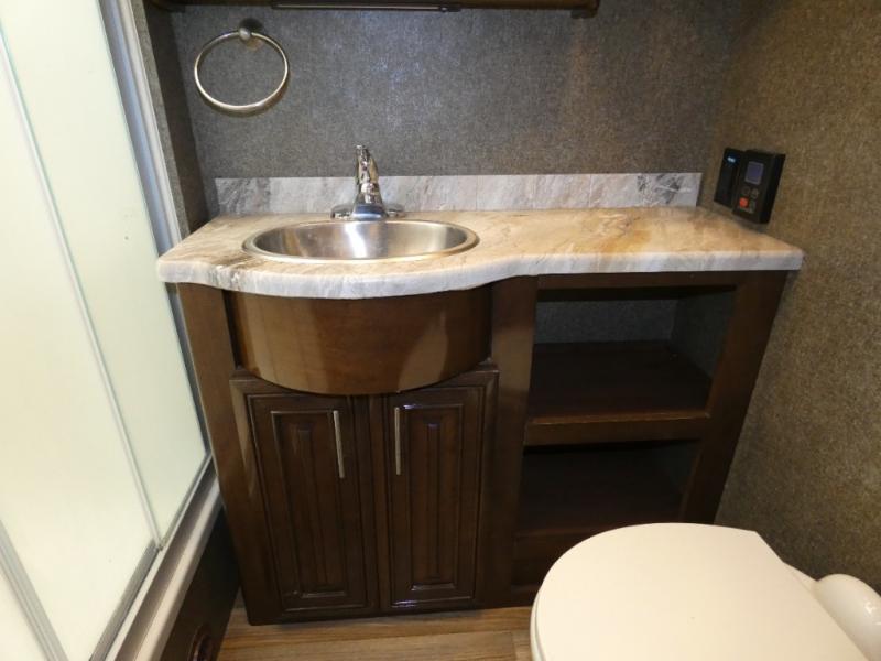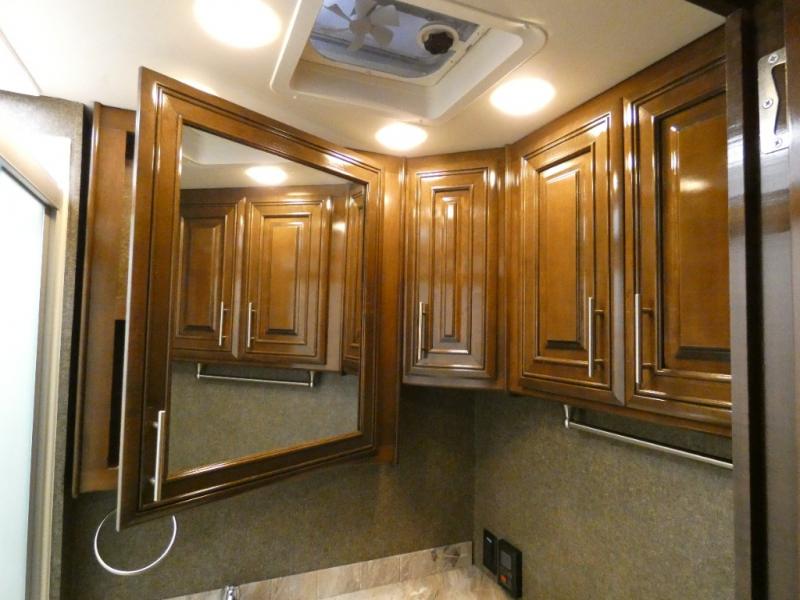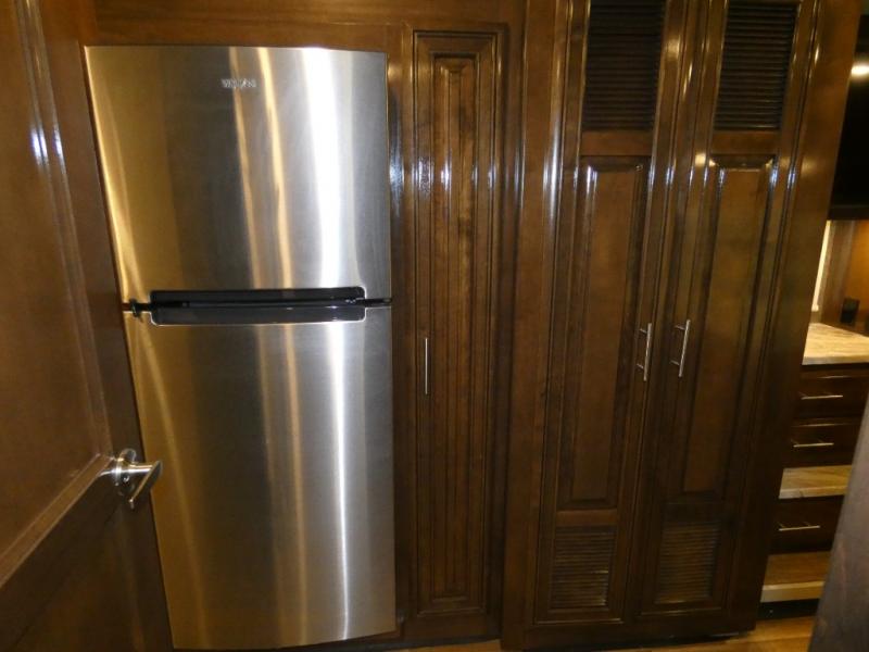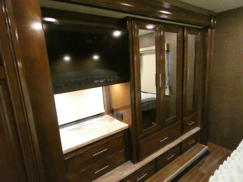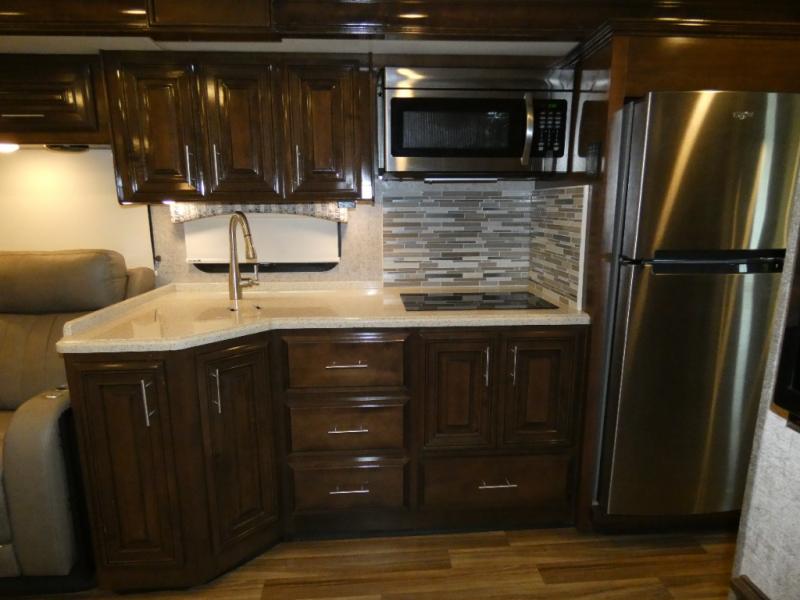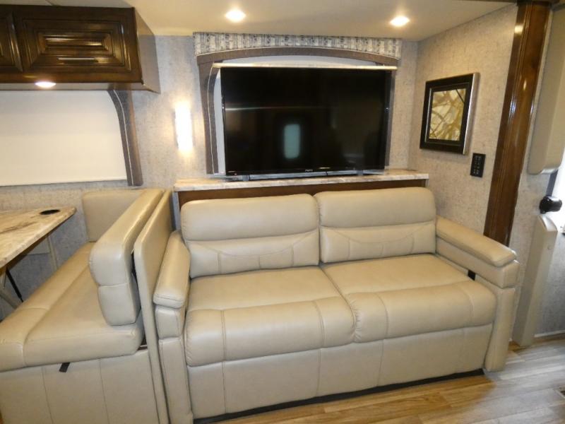 If you are looking for more interior space in your next RV which includes sleeping space for eight people, then this coach provides just that and more with a full wall slide out and a second slide out on the opposite side. In the living area you can relax on the furniture including the swivel captain's chairs and the theater seats. Above the sofa bed there is a retractable 50" LED TV and along the interior wall you will find a second TV for inside entertainment. Sleeping space can be found on the drop-down overhead cab bunk, on the furniture once set up for bedtime, and in the rear bedroom there is a Tilt-A-View inclining king bed for yourself!