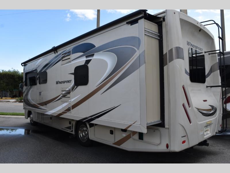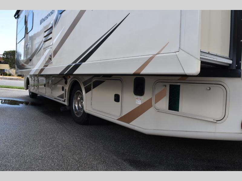 Have you been daydreaming about traveling the countryside with your spouse? Are you looking for additional sleeping space on occasion? This Windsport class A gasoline coach will have you sitting by your number one person in comfort and style. This unit features captain's chairs and a coffee table to enjoy your morning cup of Joe, a sofa bed for overnight guests, and a Dream Dinette all together providing enough seating for eight people to visit in the kitchen and living area. The king bed in the rear bedroom allows you to sleep in comfort anywhere you decide to stay. The chef will appreciate all the kitchen amenities inside when making meals including solid surface countertops, and outside when making dinner using the exterior kitchen. Everyone will appreciate the centrally located full bathroom for convenience. This unit includes an exterior 32" TV, and If you prefer to watch television when inside, you will find a 40" and 32" TV. Start traveling the way you like, in comfort and style.