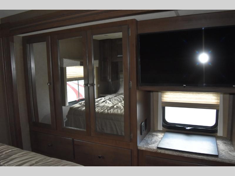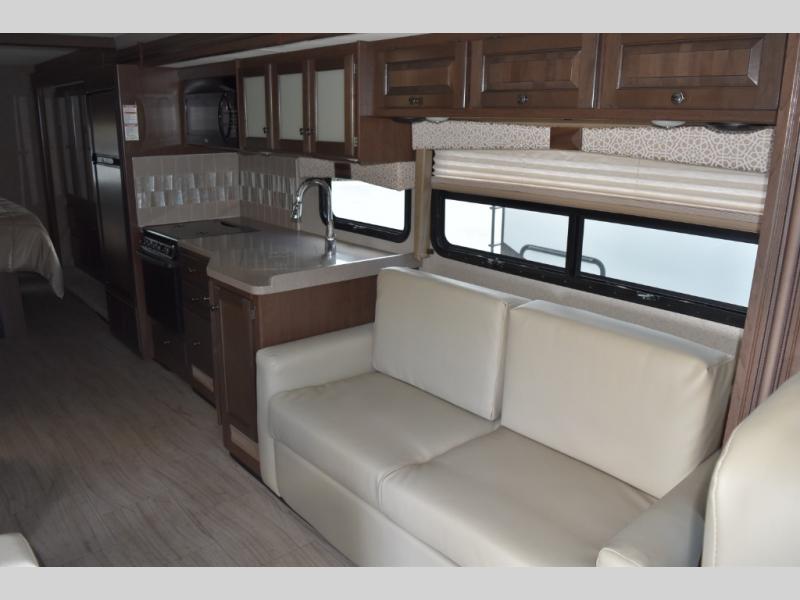 You will find there is much to love about the Windsport class A gas coaches, whether you are out for a long road trip across the country, or a weekend reunion with family. All Windsport models feature Leatherette furniture, solid surface kitchen countertops, and raised panel upper cabinet doors with nickel finish hardware and glass inserts on select doors. With the swivel and reclining captain's chairs featured in these coaches, you can easily bring them into the conversation area in the living space once parked. Each unit includes a dash workstation with 110-volt and 12-volt outlets at the passenger side for those who need to take work with them on the road, or for those who just enjoy surfing the internet. On the outside, enjoy Robocast storage compartments, an outdoor shower, and a legless lateral power awning with integrated LED lighting. Make any Windsport class A gas coach by Thor Motor Coach your new home-away-from-home today!
