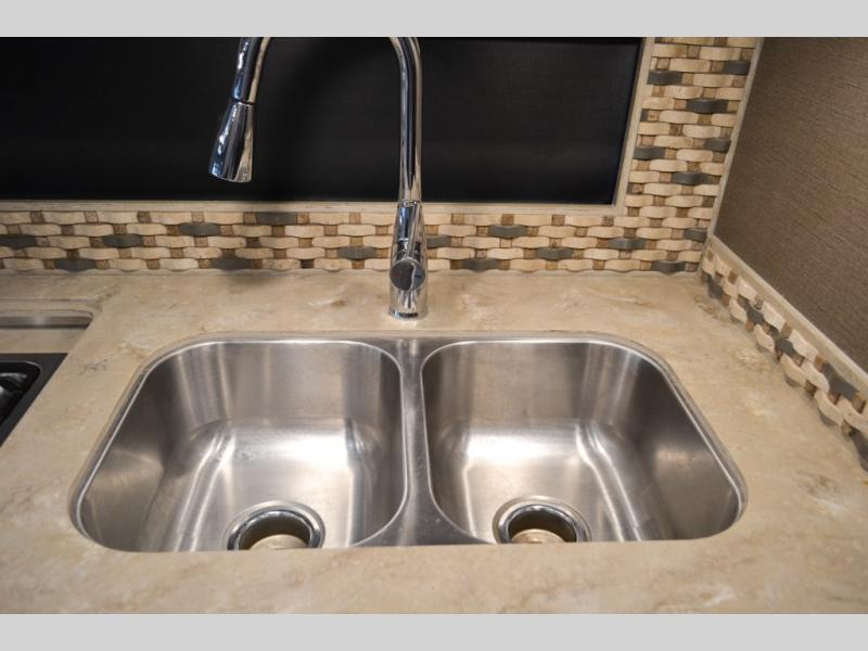 Dual Stainless Sink In Solid Surface Countertops & Galley Window