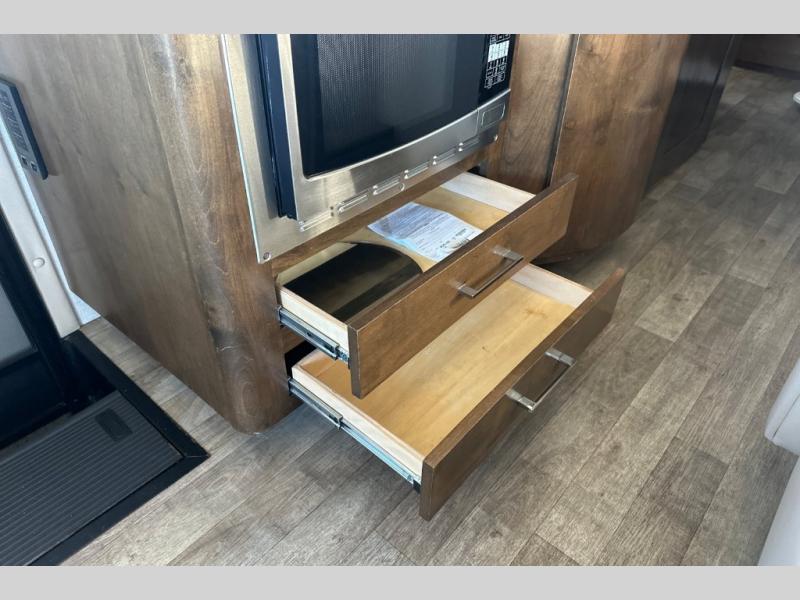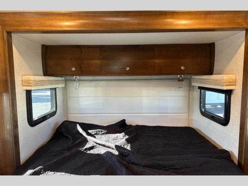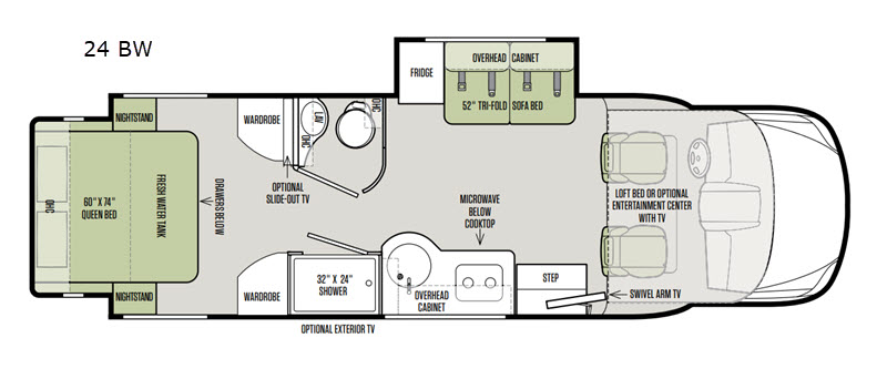 You don't have to wait very long to clean up when there is a split bathroom! This Wayfarer 24 BW class C diesel motorhome provides access to the shower separately from the private toilet and vanity with sink, now that's convenient. And if you prefer your own wardrobe, this unit allows for his and hers clothing along separate sides of the coach. The two slide outs allow more interior floor space within the living room/kitchen and the rear bedroom, plus you can stow away everything in the overhead cabinets. Looking for more sleeping space for overnight guests or your kids? The tri-fold sofa bed and the loft bed over the cab have you covered. There are several more features to see, and options to choose from.