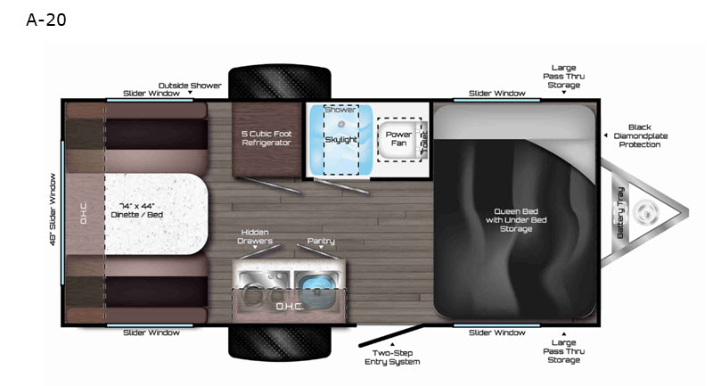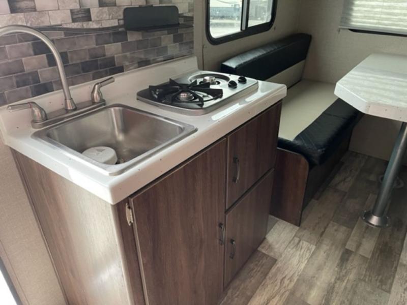 Cruise down the highway in style and confidence with this Aura travel trailer! You'll have all that you need to enjoy a successful weekend getaway with the RV queen bed, the booth dinette, the two-burner stove top, and the 5 cubic foot refrigerator. You can also use the stainless steel sink to wash up dishes after dinner, and the 48" slider window above the dinette will be a great place to view the beautiful outdoor scenery.
