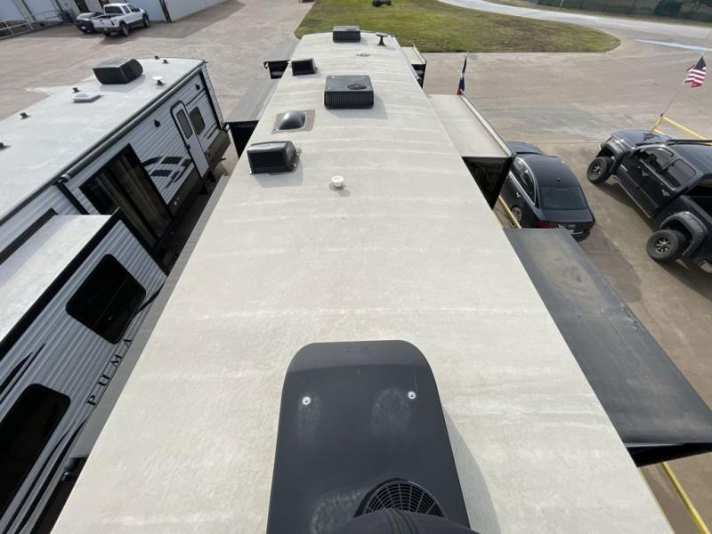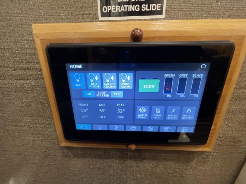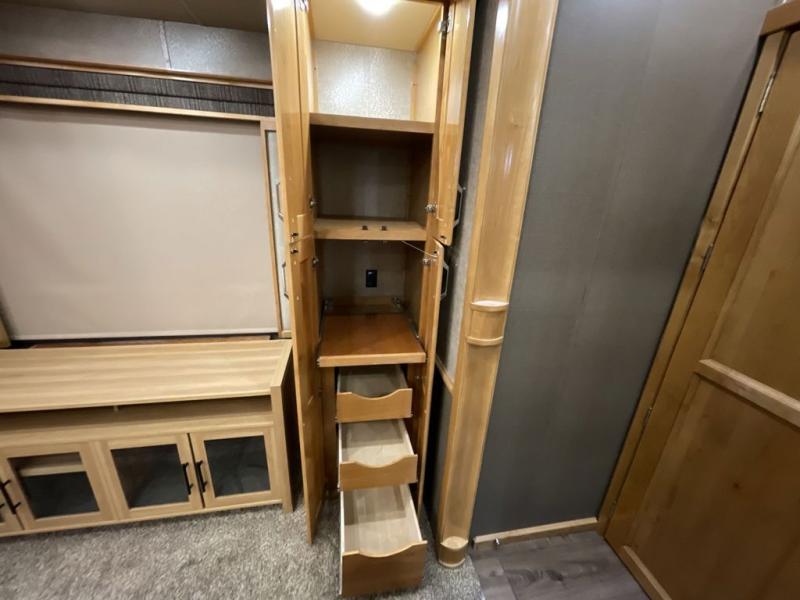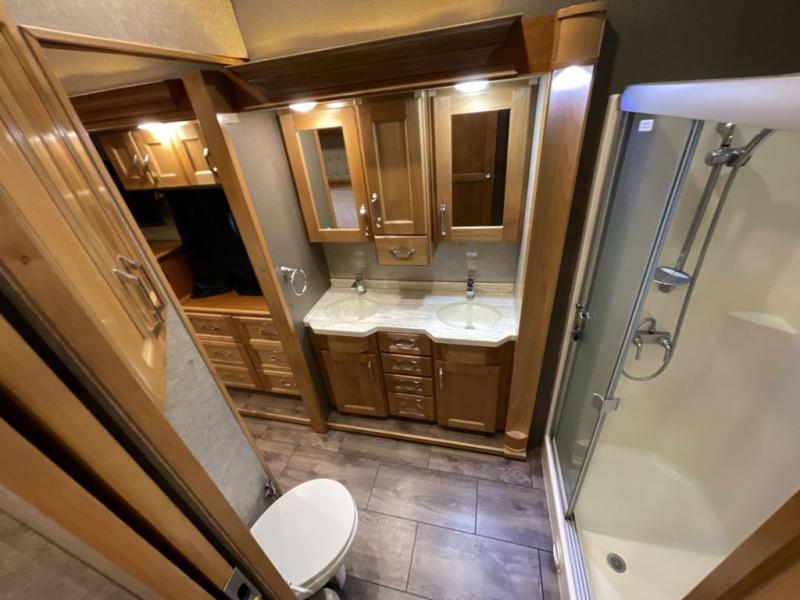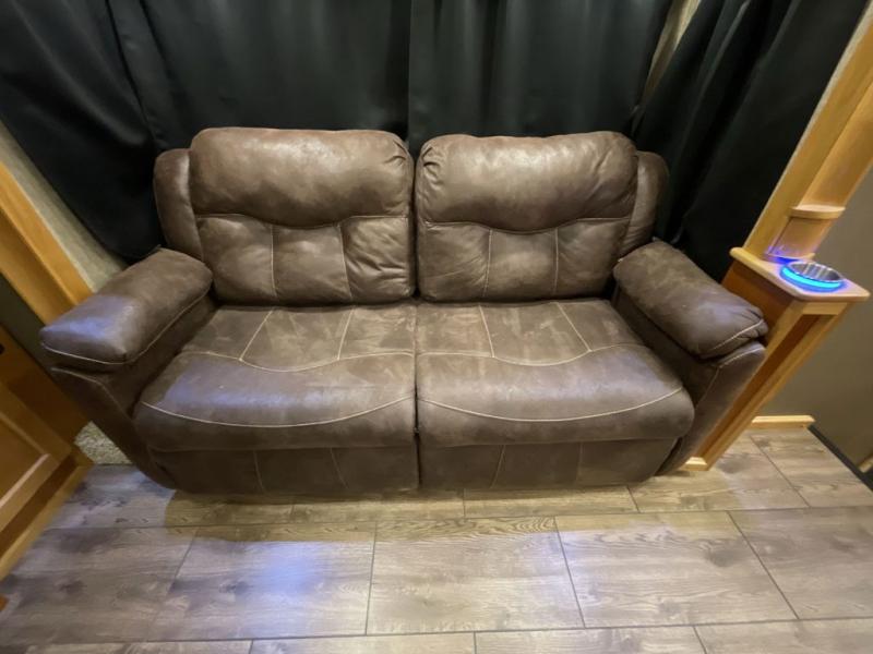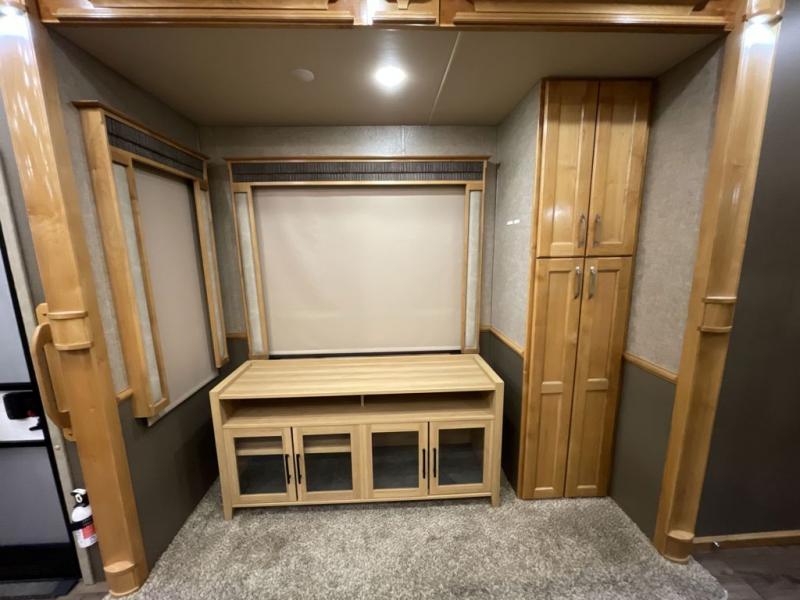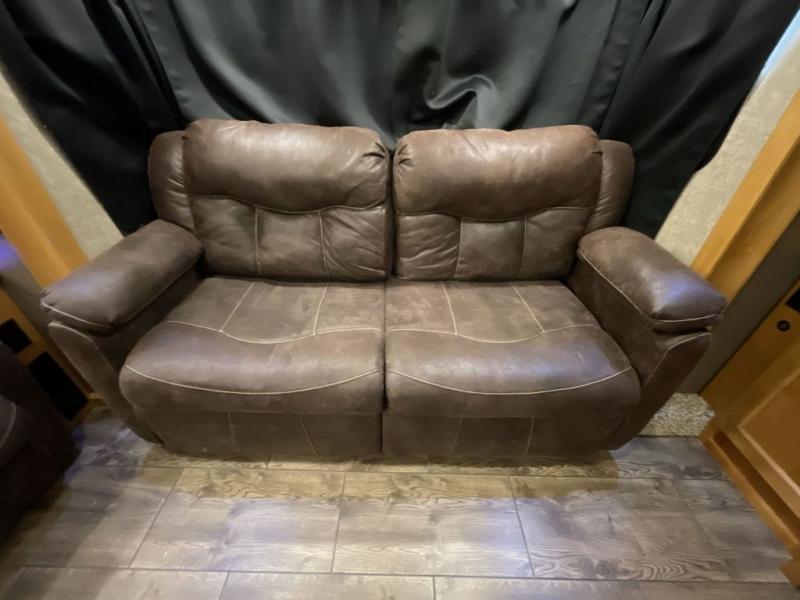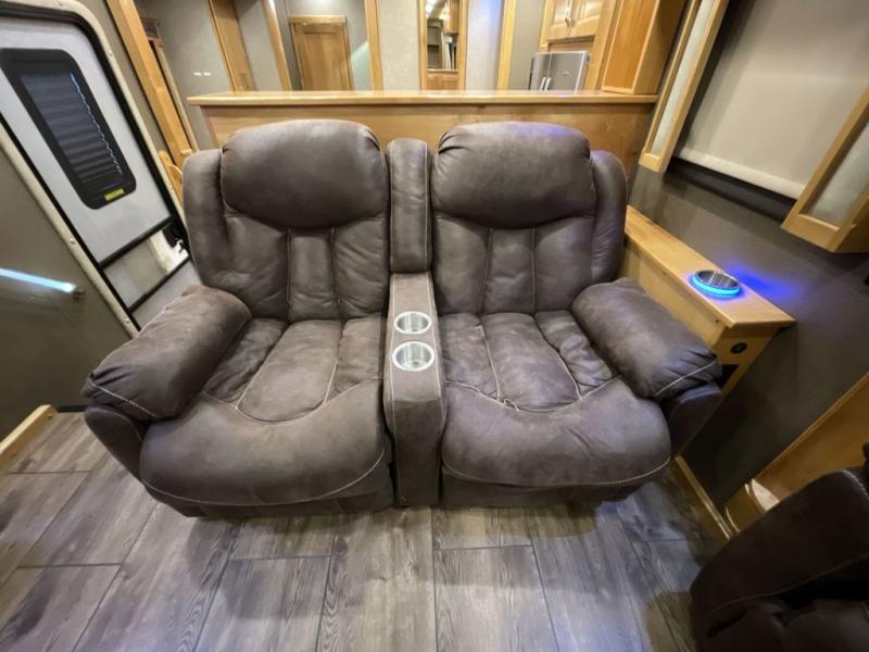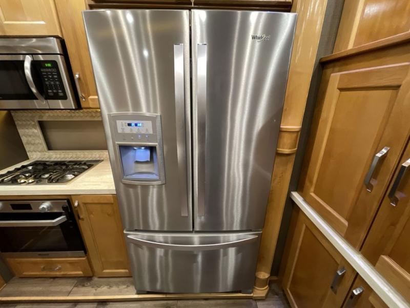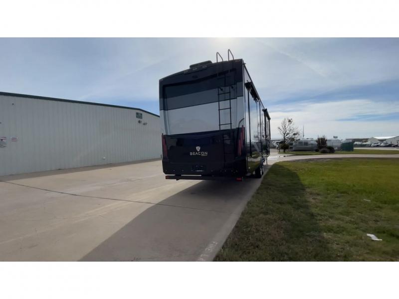 For the ultimate amount of space, you will want this six-slide Beacon fifth wheel for your family! The separated living area is just as cozy as the living room in your own home with its two 70" tri-fold sofas, its 60" theater sofa, and its 55" LED TV on top of a 40" fireplace. The kitchen area is great for meal preparations because of its extra counter space and Furrion range top. You will also find a free-standing table with chairs, a large pantry, and an 20 cubic foot Whirlpool refrigerator in the kitchen. Just before you head into the private master suite, you will find the full bathroom which features a double-sink vanity and a sliding pocket door that gives easy access into the bedroom.