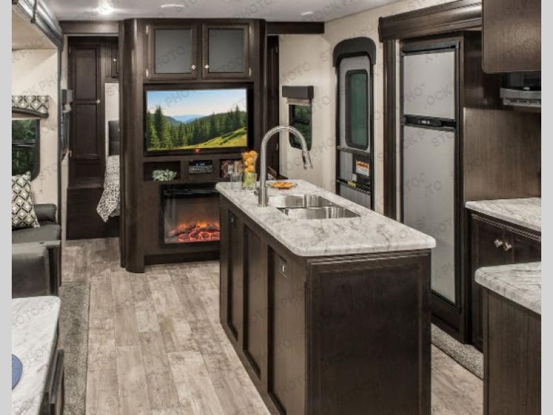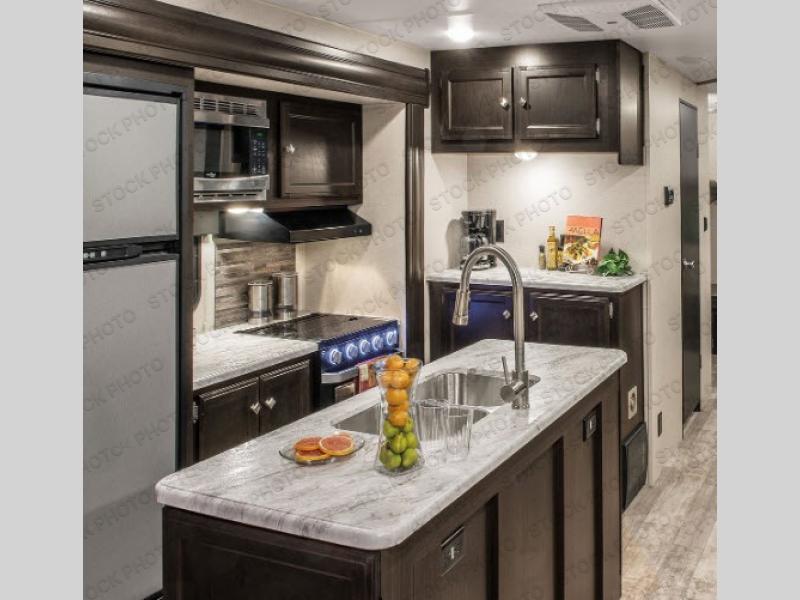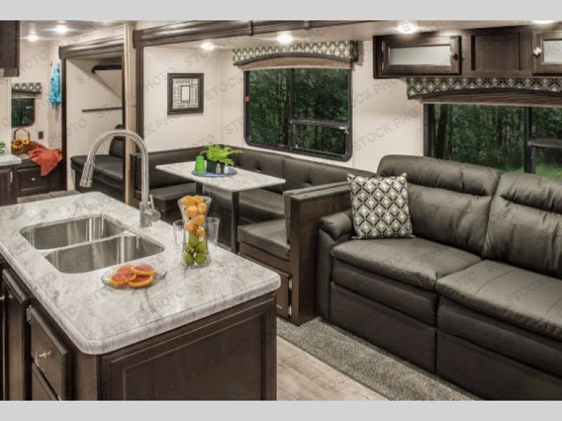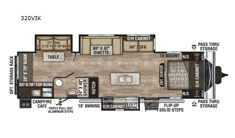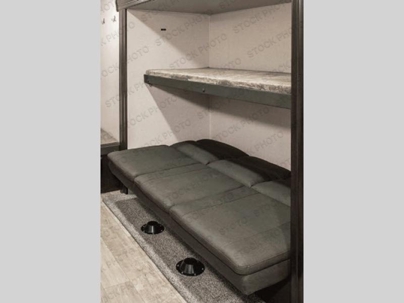 Have you heard the saying "go big or go home"? Well, you will be living it with this SportTrek travel trailer at the next campout. After hiking or fishing at the local campground, you can return to make lunch on the campfire cafe, relax outside under the awning, or go inside to rest on the 64" sofa or U-shaped dinette. You might even envision the kids taking a nap in the bunkhouse on one of the triple bunks or reading a book while sitting on their own sofa. The private bedroom will not disappoint either. There are more features to see, such as dual entry into the trailer, a hutch to store things, and more!