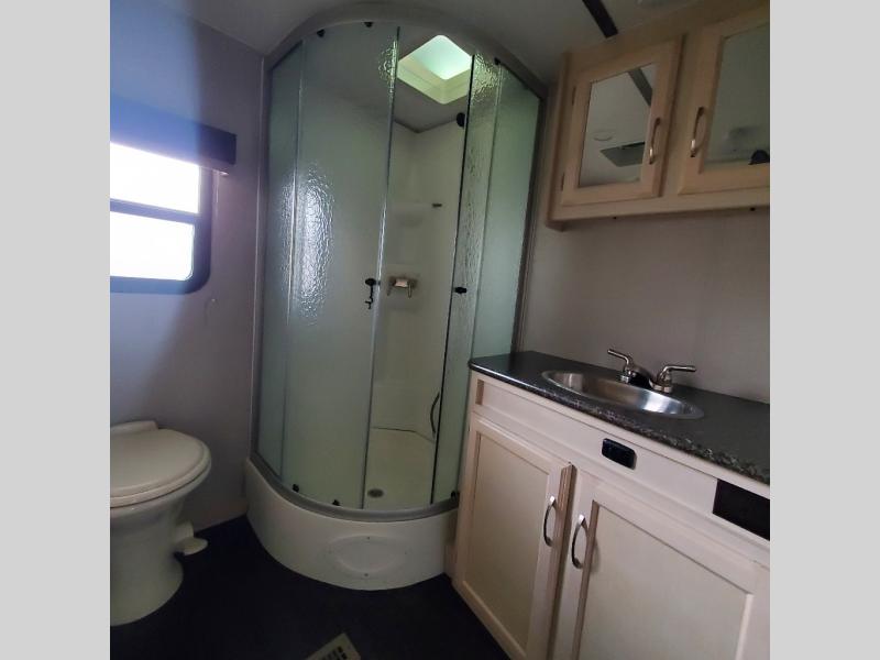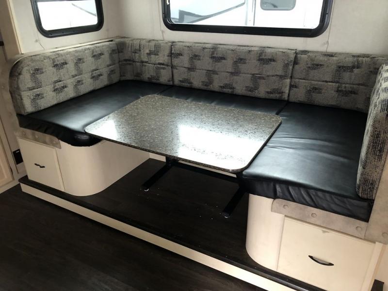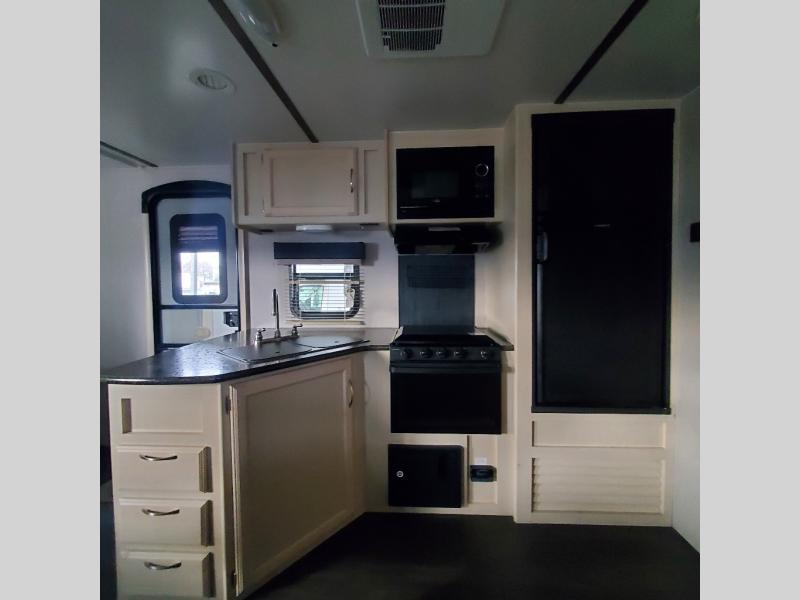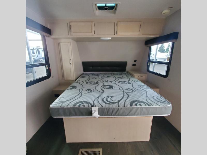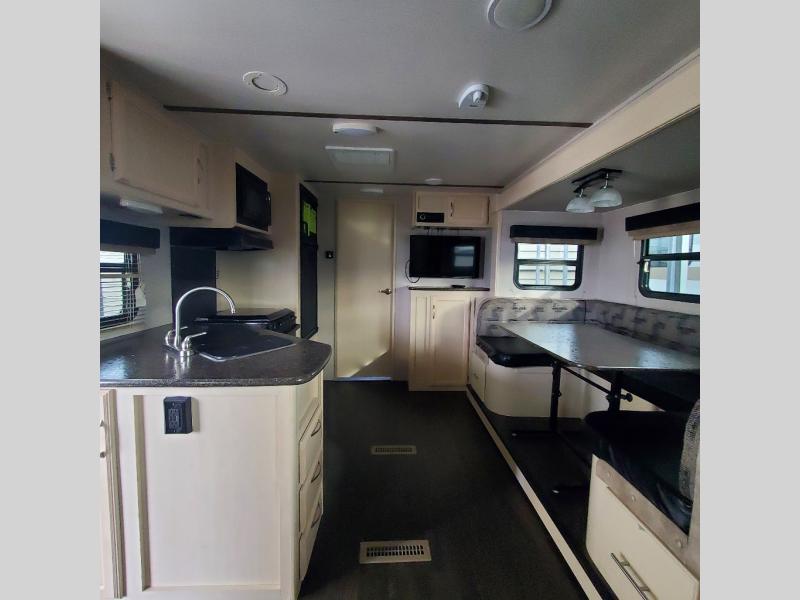 Camp comfortably for the weekend or more in this spacious, lightweight Minnie travel trailer. This model offers a spacious rear bath including a large wardrobe for your clothing. In fact, you will find abundant storage throughout the entire unit both inside and out. You can easily dine inside with added family or friends thanks to the U-shaped dinette slide out, and if you need extra sleeping space, the dinette easily folds down into a comfortable bed. The queen bed up front will also provide a great night's sleep. For a bit of privacy, there is a curtain that can be pulled to separate the queen bed from anyone who is sleeping on the dinette if you like, and to spend maximum time outdoors, you can choose to cook breakfast, lunch, and dinner outside during nice weather with the aid of an outdoor kitchen that includes a single sink, a two-burner cooktop, and refrigerator.