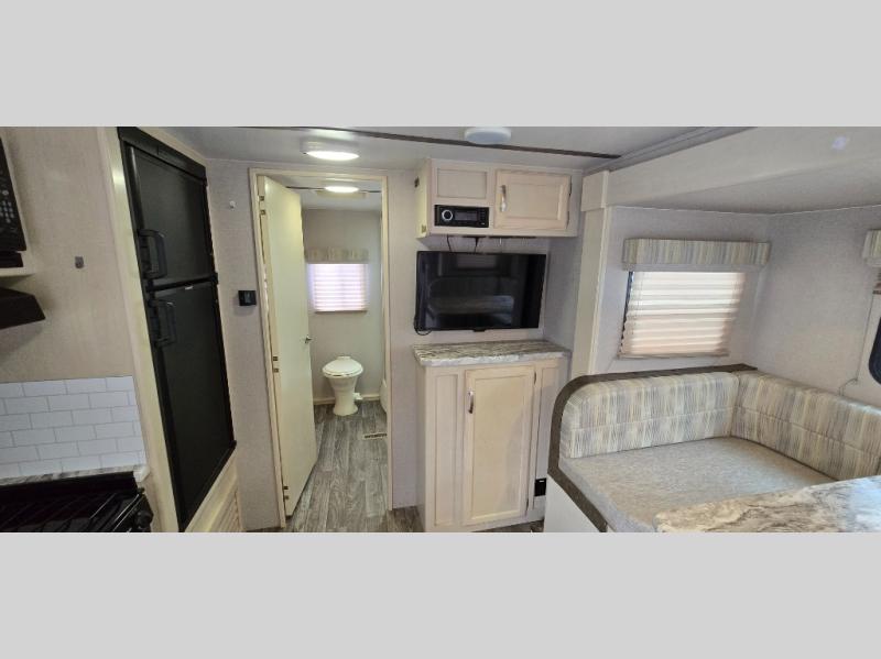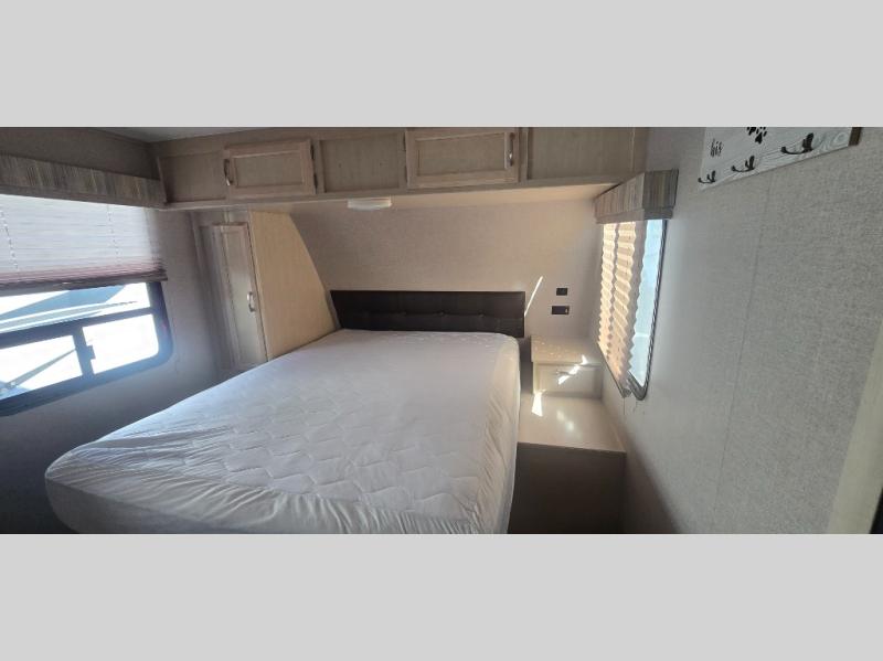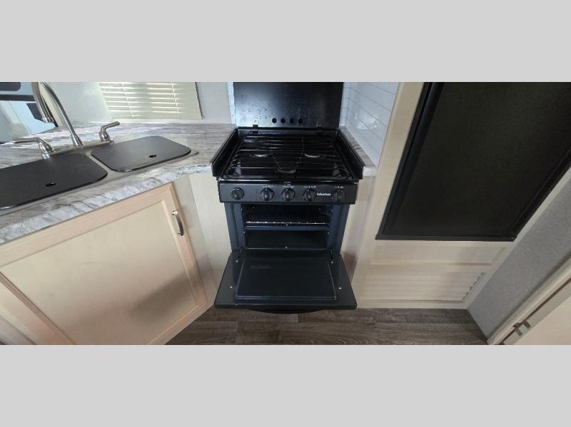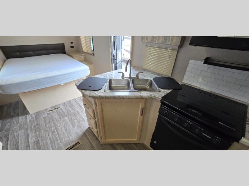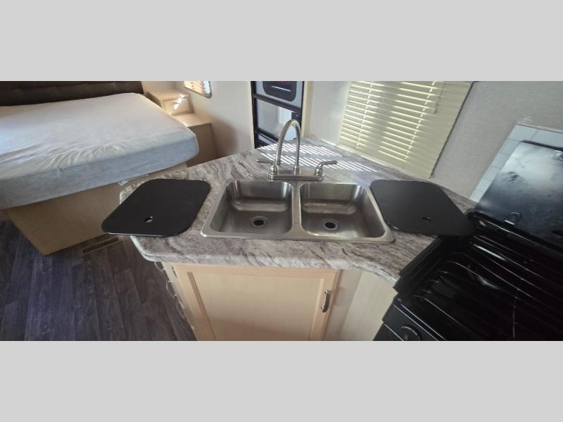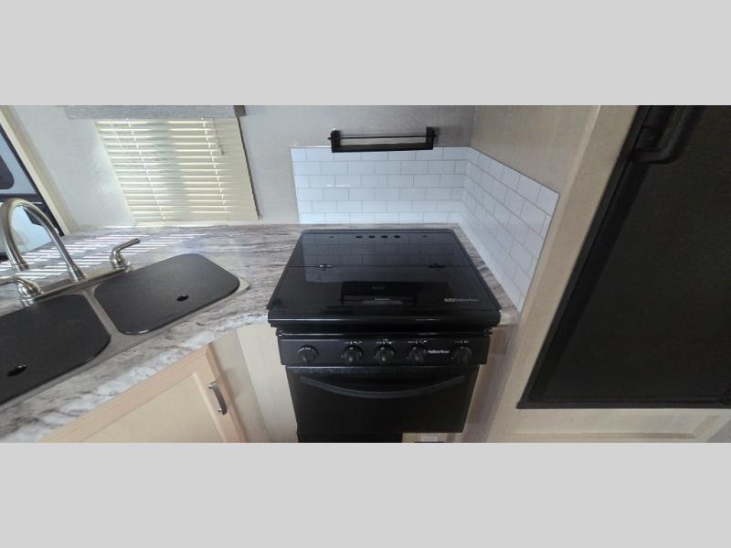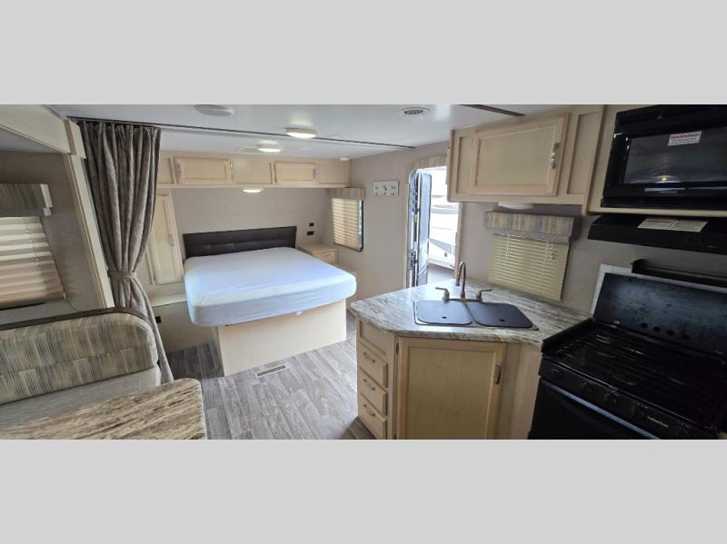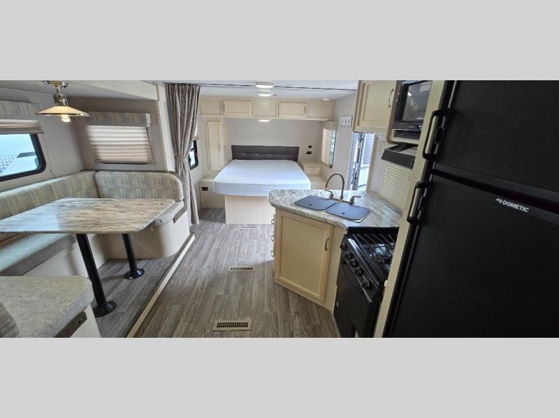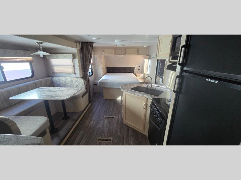 Camp comfortably for the weekend or more in this spacious, lightweight Minnie travel trailer. This model offers a spacious rear bath including a large wardrobe for your clothing. In fact, you will find abundant storage throughout the entire unit both inside and out. You can easily dine inside with added family or friends thanks to the U-shaped dinette slide out, and if you need extra sleeping space, the dinette easily folds down into a comfortable bed. The queen bed up front will also provide a great night's sleep. For a bit of privacy, there is a curtain that can be pulled to separate the queen bed from anyone who is sleeping on the dinette if you like, and to spend maximum time outdoors, you can choose to cook breakfast, lunch, and dinner outside during nice weather with the aid of an outdoor kitchen that includes a single sink, a two-burner cooktop, and refrigerator.