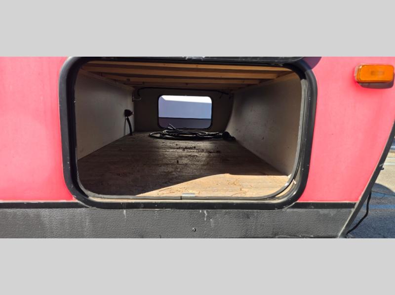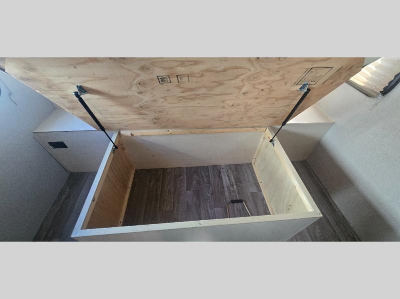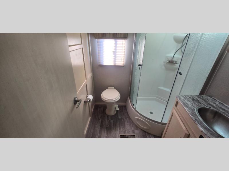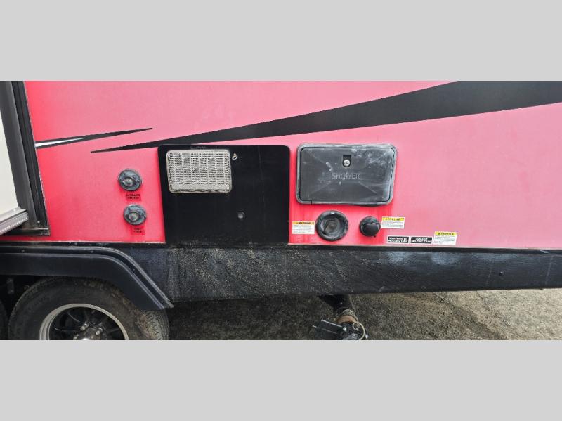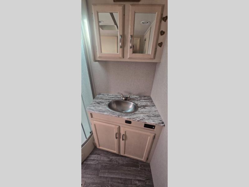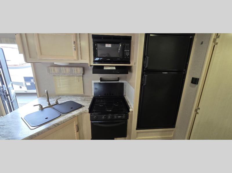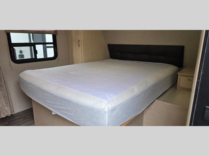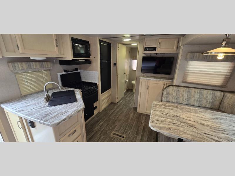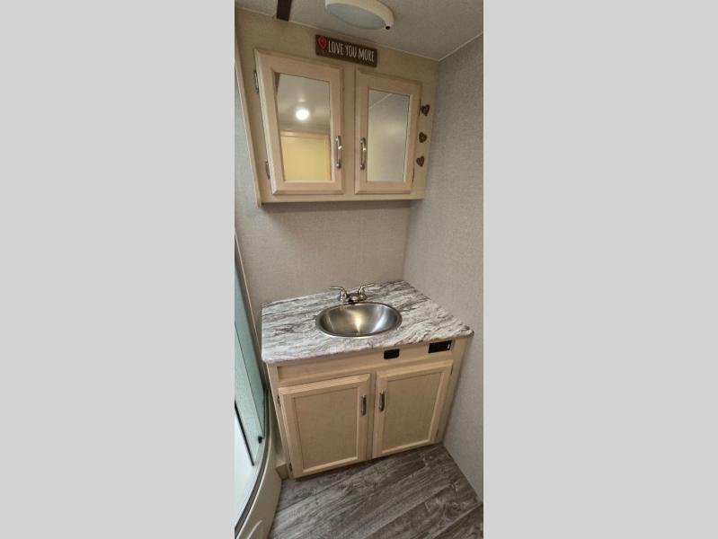 Camp comfortably for the weekend or more in this spacious, lightweight Minnie travel trailer. This model offers a spacious rear bath including a large wardrobe for your clothing. In fact, you will find abundant storage throughout the entire unit both inside and out. You can easily dine inside with added family or friends thanks to the U-shaped dinette slide out, and if you need extra sleeping space, the dinette easily folds down into a comfortable bed. The queen bed up front will also provide a great night's sleep. For a bit of privacy, there is a curtain that can be pulled to separate the queen bed from anyone who is sleeping on the dinette if you like, and to spend maximum time outdoors, you can choose to cook breakfast, lunch, and dinner outside during nice weather with the aid of an outdoor kitchen that includes a single sink, a two-burner cooktop, and refrigerator.
