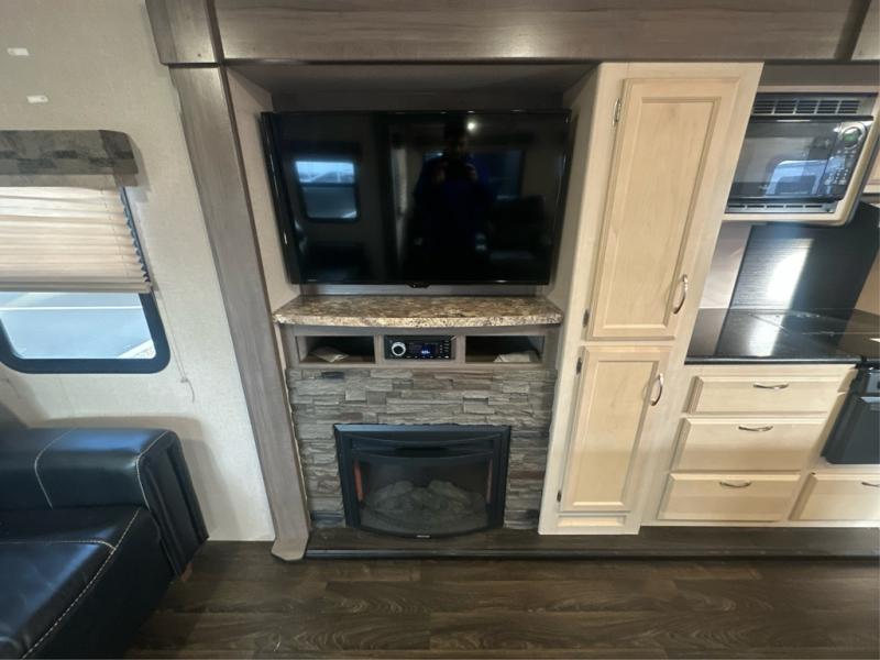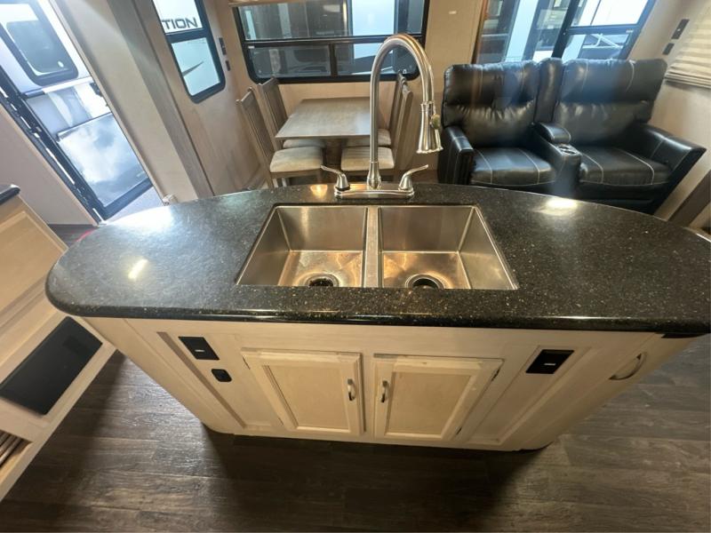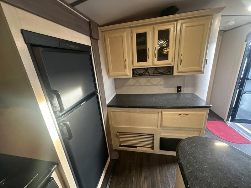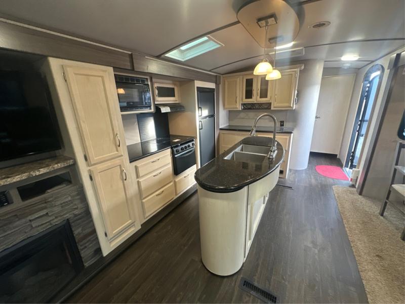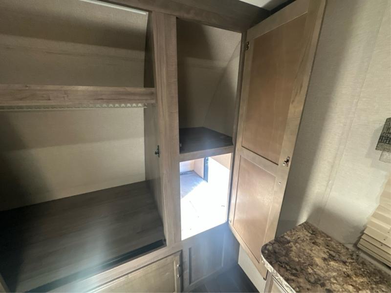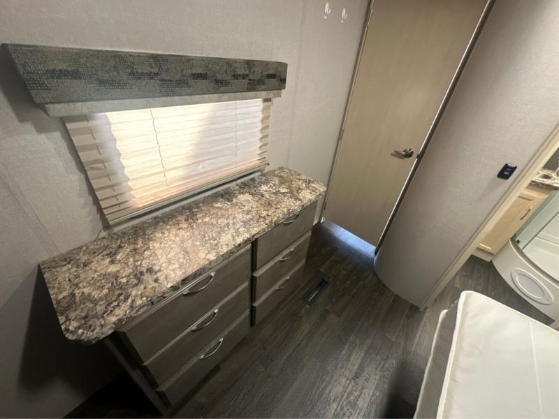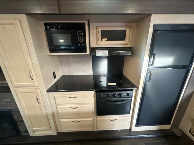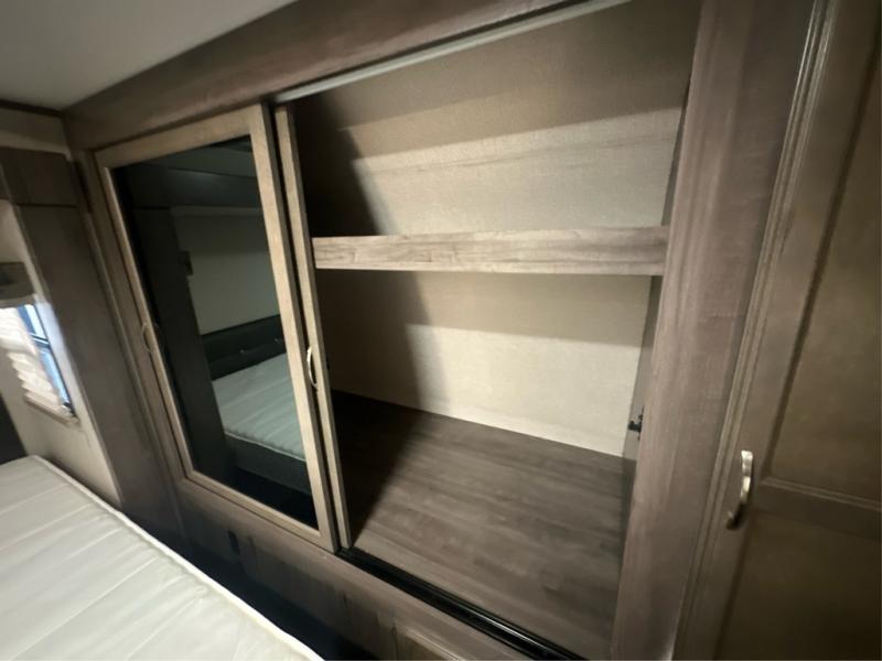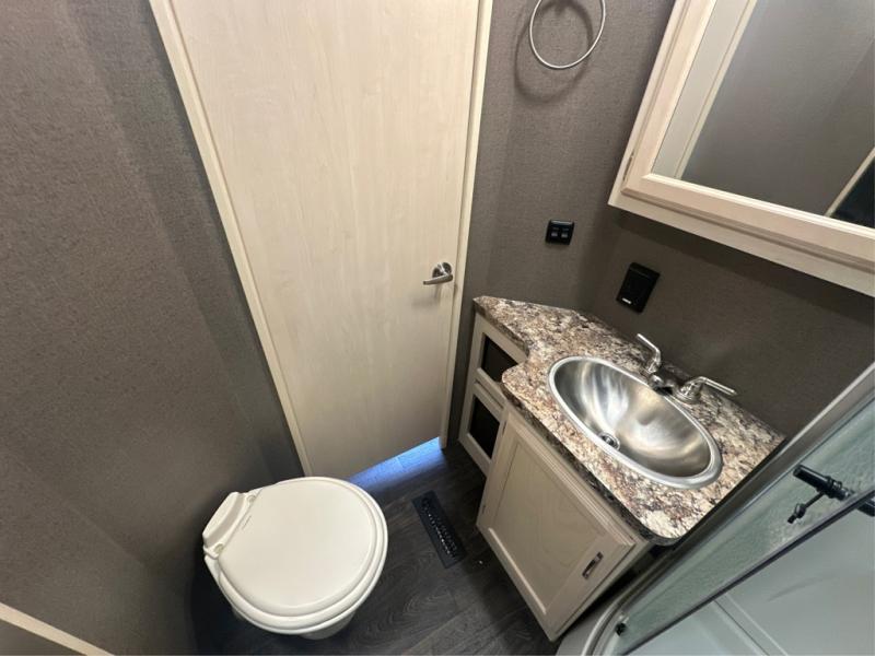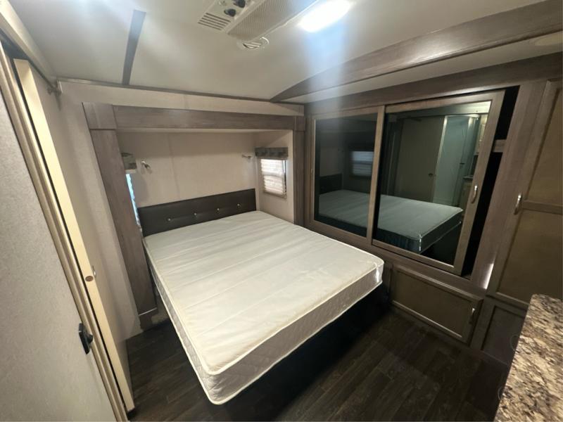 Traveling with the comforts of home is taken care of in this Minnie Plus. You will not miss your kitchen when you see all this kitchen has to offer such as a galley island and buffet/hutch not to mention the appliances and solid surface countertops. You will also appreciate all the floor space thanks to the dual slide outs in the main living and kitchen area, plus the queen bed slide in the bedroom. There is plenty of furniture to choose from including theater seats to relax in while visiting with the cook. The dual entry bathroom, and storage in the master bedroom will have you thinking you are at a resort every time you take this trailer with you.