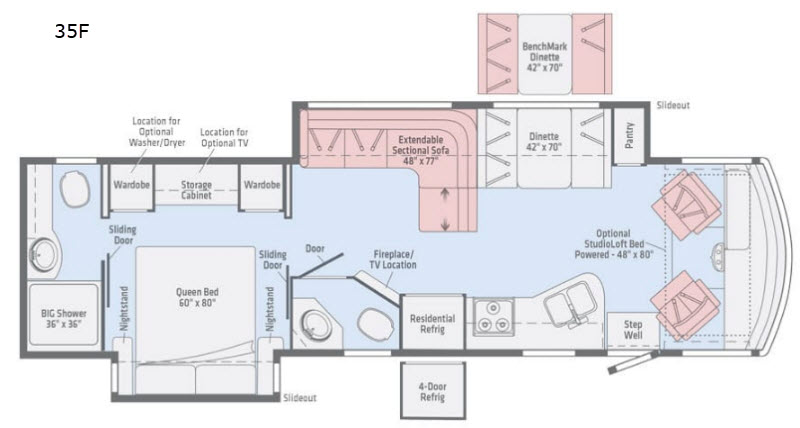 For the larger family, this Winnebago Sunstar LX 35F class A gas coach features sleeping for eight, triple slide outs for a spacious interior, and all the amenities you need to enjoy spending time on the road. Come visit with your family at the extendable sectional sofa and at night this area can be used for sleeping space. In the kitchen you can store your perishables in the residential refrigerator and fix a quick snack or your meal at the three burner range. With a bath and a half there is enough room to get ready for the day and in the master bathroom you will find a 36" x 36" BIG shower!
