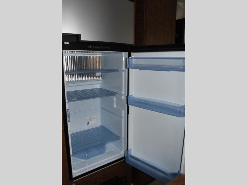 Step inside and you’ll immediately notice the bright, modern interior accented by panoramic windows that bring in natural light and scenic views. The front walkaround queen bed offers a comfortable retreat with convenient storage, making it easy to unwind after a day of travel or exploration.