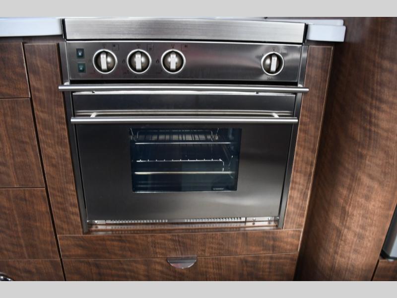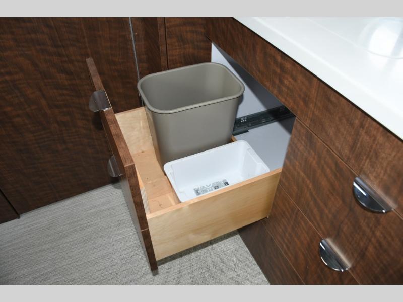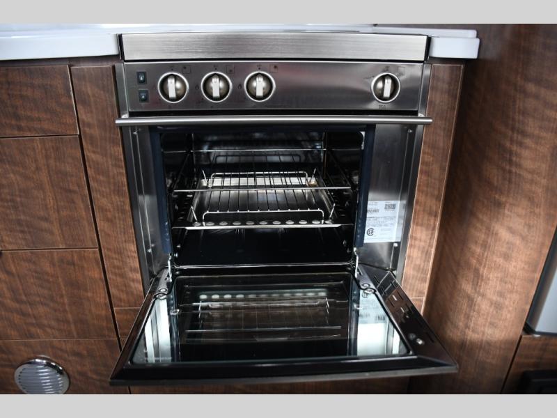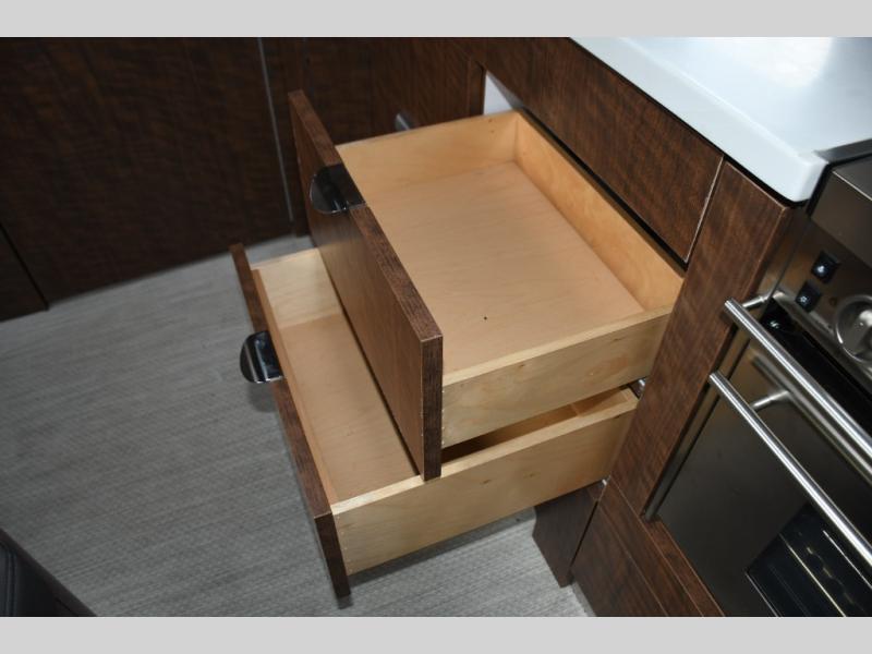 The rear living and dining area is thoughtfully designed for versatility. Whether you’re enjoying meals, relaxing indoors, or hosting friends at the campground, the layout adapts easily to your needs. The sleek galley features quality appliances, solid-surface countertops, and efficient storage, allowing you to cook and dine with ease while on the road.
