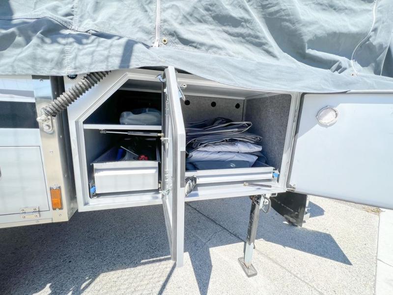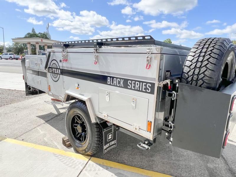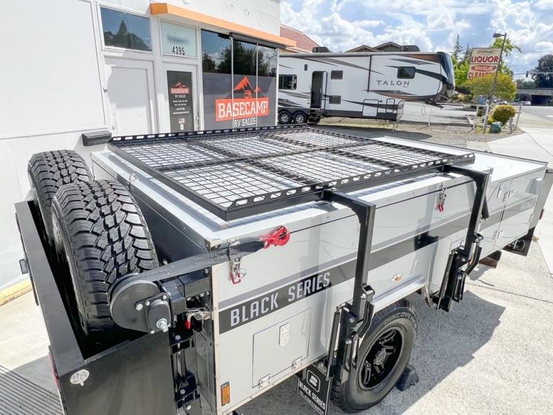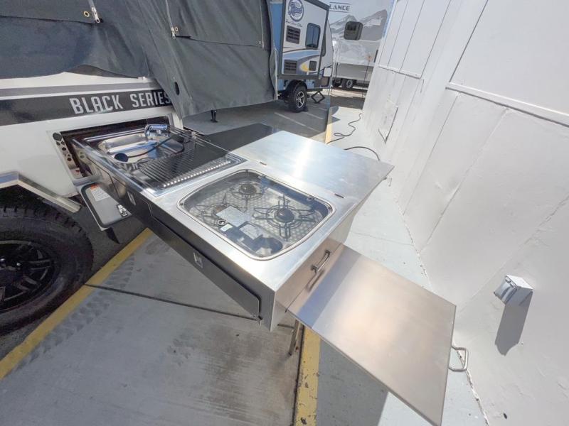 With its clever use of space and innovative design, this Black Series pop-up camper is both practical and comfortable! You will enjoy spending your days preparing meals in the fresh air with the outdoor stainless steel kitchen, and when you get tired from the day's events, you can rest on the queen-size mattress for the night. You will be woken up each morning by the bright sunlight coming through the large windows, and the 50 AMP power will give you the ability to use your favorite appliances.